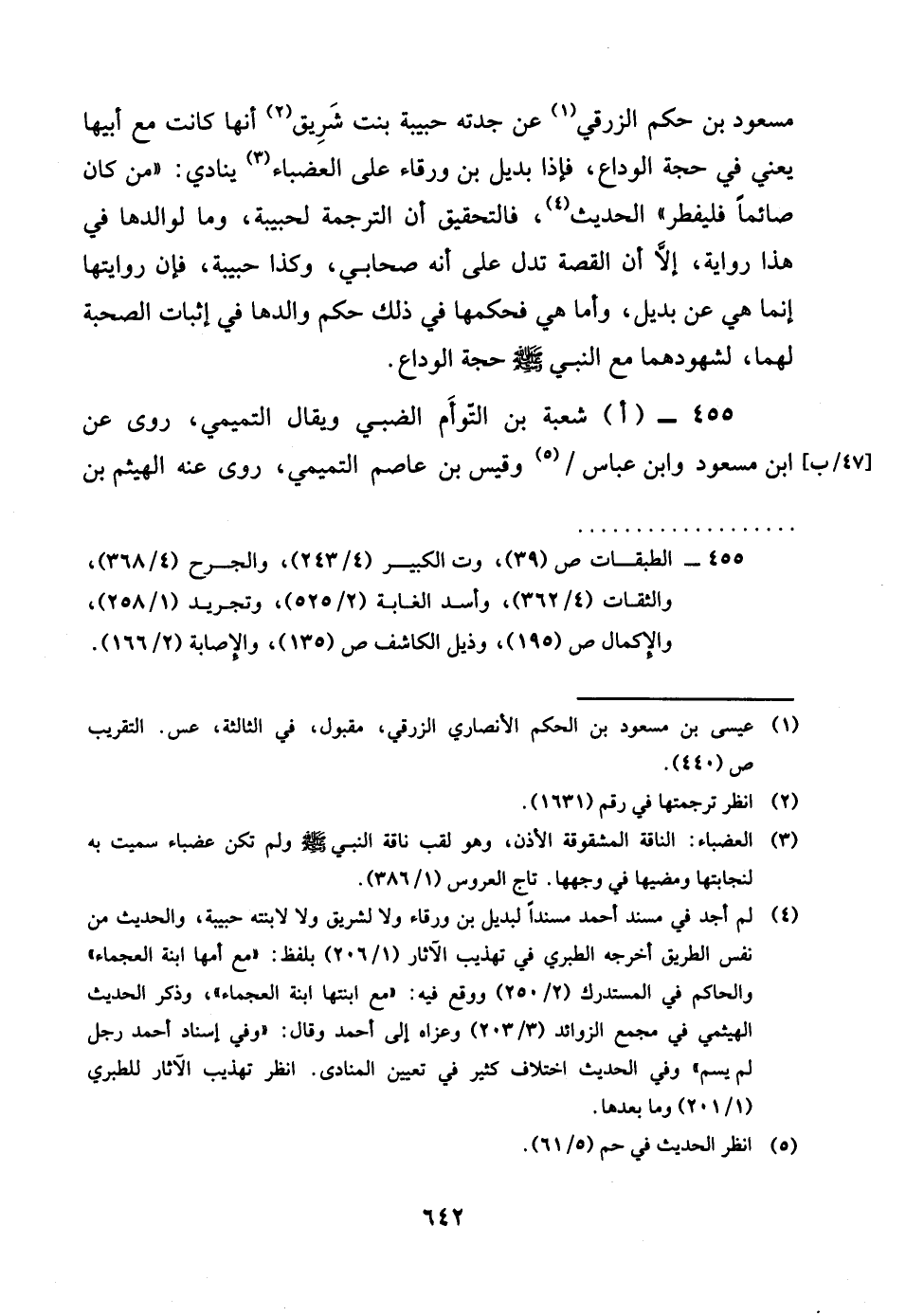 مَسْعُود بن حكم الزرقي عَن جدته حَبِيبَة بنت شريق أَنَّهَا كَانَت مَعَ أَبِيهَا يَعْنِي فِي حجَّة الْوَدَاع فَإِذا بديل بن وَرْقَاء على العضباء يُنَادي من كَانَ صَائِما فليفطر الحَدِيث فالتحقيق أَن التَّرْجَمَة لحبيبة وَمَا لوالدها فِي هَذَا رِوَايَة الا أَن الْقِصَّة تدل على أَنه صَحَابِيّ وَكَذَا حَبِيبَة فَإِن رِوَايَتهَا إِنَّمَا هِيَ عَن بديل واما هِيَ فَحكمهَا فِي ذَلِك حكم والدها فِي اثبات الصُّحْبَة لَهما لشهودهما مَعَ النَّبِي صلى الله عَلَيْهِ وَسلم حجَّة الْوَدَاع