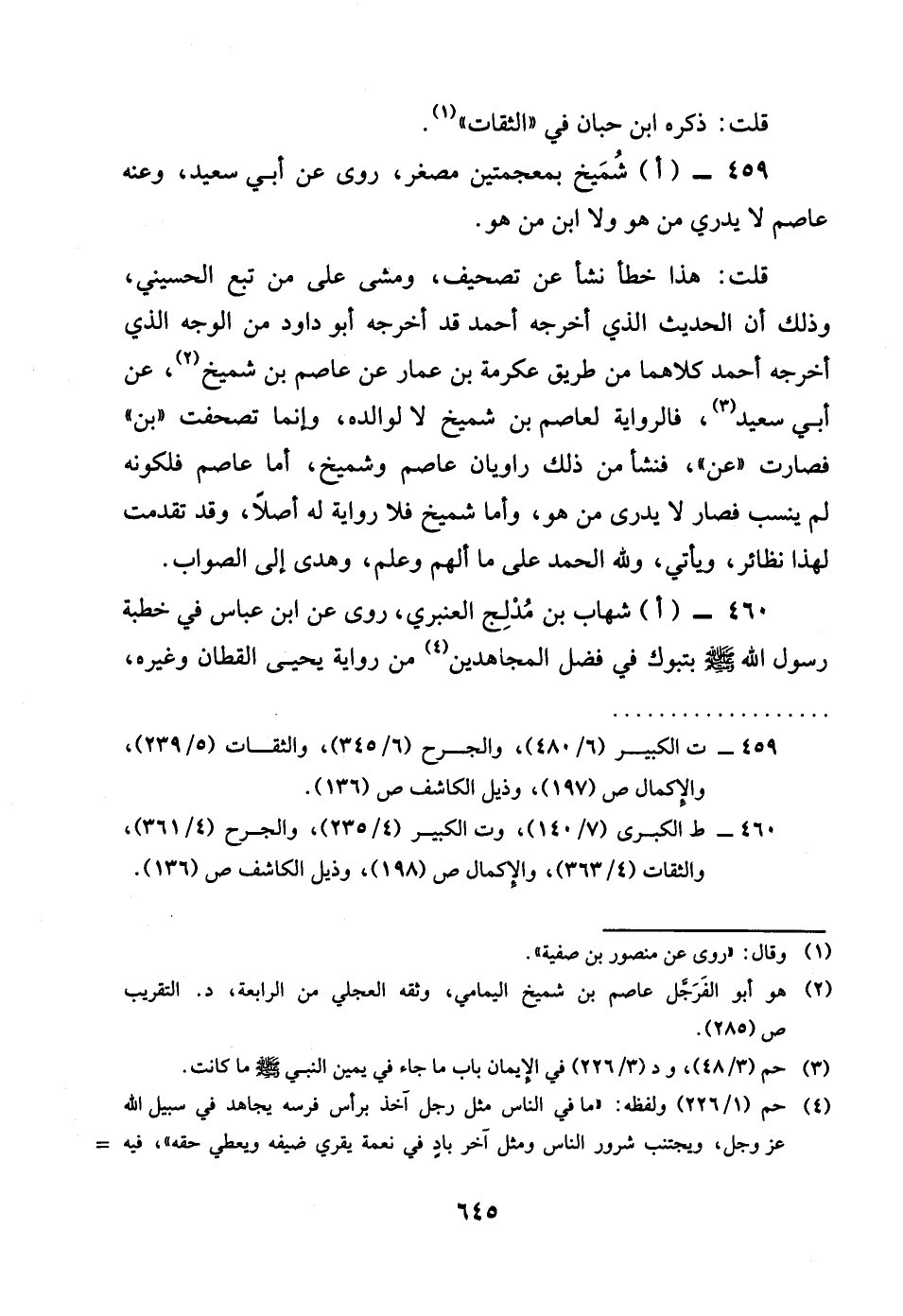 459 - اشميخ بمعجمتين مُصَغرًا روى عَن أبي سعيد وَعنهُ عَاصِم لَا يدْرِي من هُوَ وَلَا بن من هُوَ قلت هَذَا خطأ نَشأ عَن تَصْحِيف وَمَشى على من تبع الْحُسَيْنِي وَذَلِكَ أَن الحَدِيث الَّذِي أخرجه أَحْمد قد أخرجه أَبُو دَاوُد من الْوَجْه الَّذِي أخرجه أَحْمد كِلَاهُمَا من طَرِيق عِكْرِمَة بن عمار عَن عَاصِم بن شميخ عَن أبي سعيد فَالرِّوَايَة لعاصم بن شميخ لَا لوالده وانما تصحفت بن فَصَارَت عَن فَنَشَأَ من ذَلِك راويان عَاصِم وشميخ أما عَاصِم فلكونه لم ينْسب فَصَارَ لَا يدْرِي من هُوَ واما شميخ فَلَا رِوَايَة لَهُ أصلا وَقد تقدّمت لهَذَا نَظَائِر وَيَأْتِي وَللَّه الْحَمد على مَا ألهم وَعلم وَهدى الى الصَّوَاب