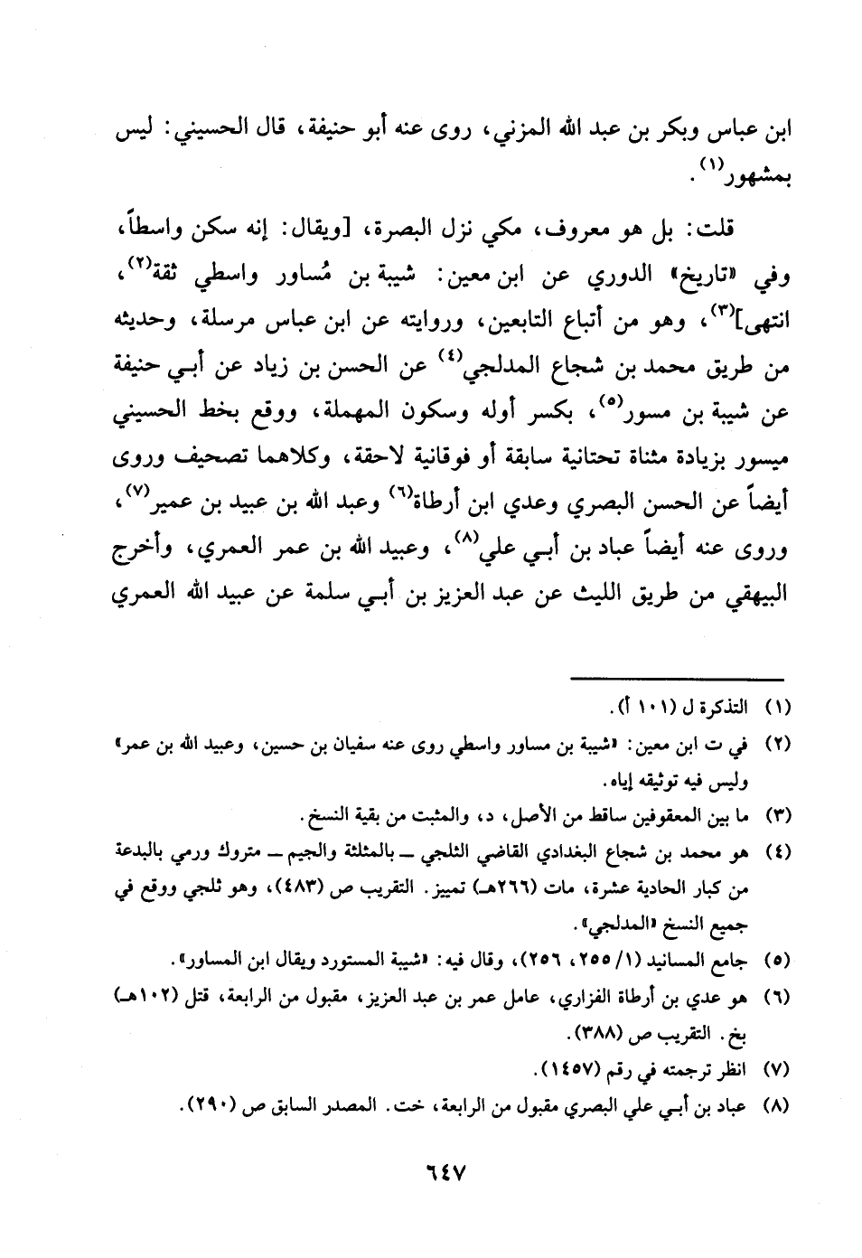 بن عَبَّاس وَبكر بن عبد الله الْمُزنِيّ روى عَنهُ أَبُو حنيفَة قَالَ الْحُسَيْنِي لَيْسَ بِمَشْهُور قلت بل هُوَ مَعْرُوف مكي نزل الْبَصْرَة وَيُقَال أَنه سكن واسطا وَفِي تَارِيخ الدوري عَن بن معِين شيبَة بن مساور واسطي ثِقَة انْتهى وَهُوَ من اتِّبَاع التَّابِعين وَرِوَايَته عَن بن عَبَّاس مُرْسلَة وَحَدِيثه من طَرِيق مُحَمَّد بن شُجَاع المدلجي عَن الْحسن بن زِيَاد عَن أبي حنيفَة عَن شيبَة بن مسور بِكَسْر أَوله وَسُكُون الْمُهْملَة وَوَقع بِخَط الْحُسَيْنِي ميسور بِزِيَادَة مثناة تَحْتَانِيَّة سَابِقَة أَو فوقانية لاحقة وَكِلَاهُمَا تَصْحِيف وروى أَيْضا عَن الْحسن الْبَصْرِيّ وعدي بن أَرْطَأَة وَعبد الله بن عبيد بن عُمَيْر وروى عَنهُ أَيْضا عباد بن أبي عَليّ وَعبيد الله بن عمر الْعمريّ واخرج الْبَيْهَقِيّ من طَرِيق اللَّيْث عَن عبد الْعَزِيز بن أبي سَلمَة عَن عبيد الله الْعمريّ