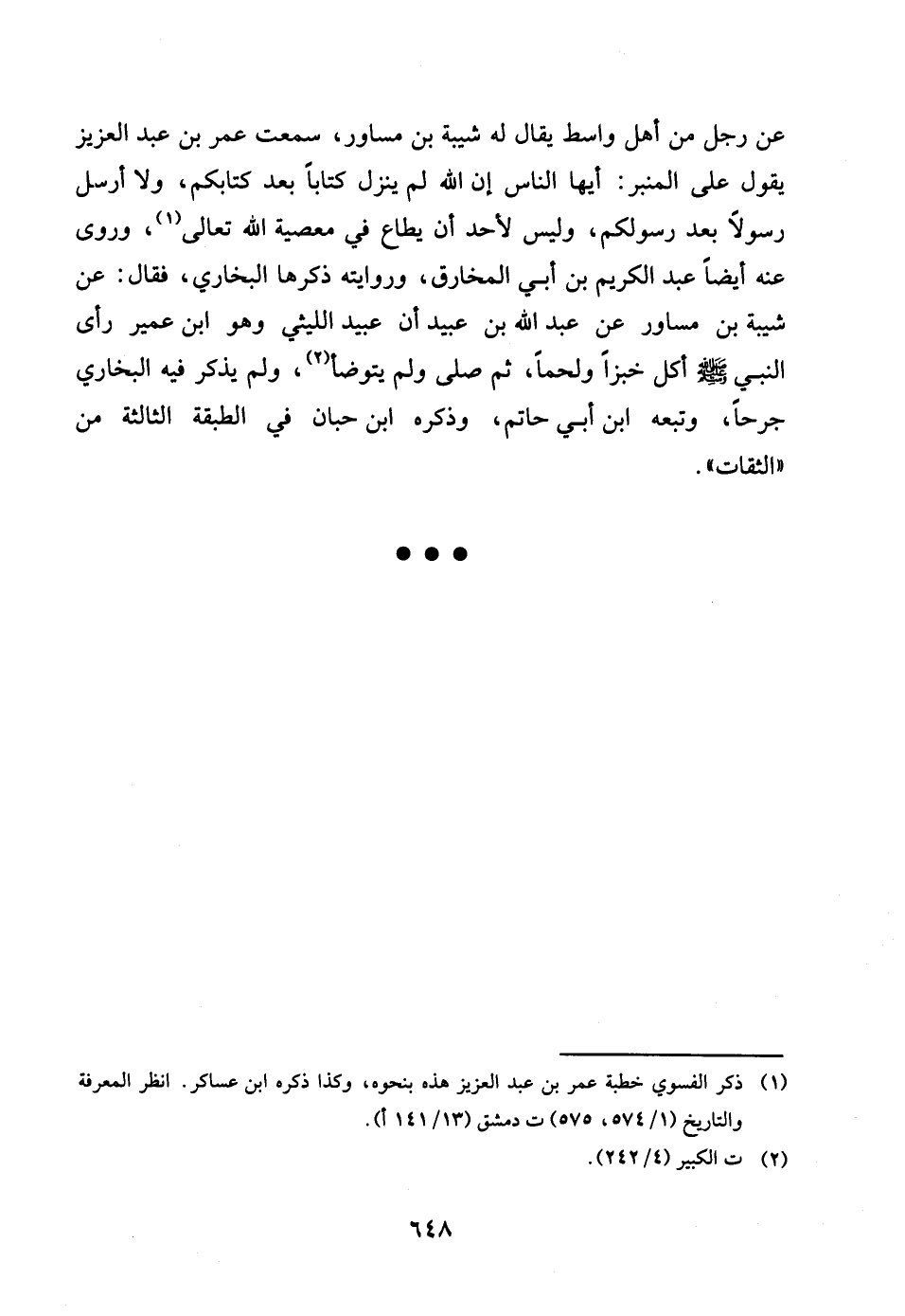 عَن رجل من أهل وَاسِط يُقَال لَهُ شيبَة بن مساور سَمِعت عمر بن عبد الْعَزِيز يَقُول على الْمِنْبَر أَيهَا النَّاس إِن الله لم ينزل كتابا بعد كتابكُمْ وَلَا أرسل رَسُولا بعد رَسُولكُم وَلَيْسَ لَاحَدَّ أَن يطاع فِي مَعْصِيّة الله تَعَالَى وروى عَنهُ أَيْضا عبد الْكَرِيم بن أبي الْمخَارِق وَرِوَايَته ذكرهَا البُخَارِيّ فَقَالَ عَن شيبَة بن مساور عَن عبد الله بن عبيد أَن عبيد اللَّيْثِيّ وَهُوَ بن عُمَيْر رأى النَّبِي صلى الله عَلَيْهِ وَسلم أكل خبْزًا وَلَحْمًا ثمَّ صلى وَلم يتَوَضَّأ وَلم يذكر فِيهِ البُخَارِيّ جرحا وَتَبعهُ بن أبي حَاتِم وَذكره بن حبَان فِي الطَّبَقَة الثَّالِثَة من الثِّقَات