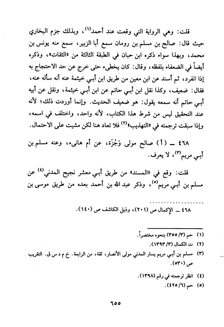 قلت وَهِي الرِّوَايَة الَّتِي وَقعت عِنْد أَحْمد وَبِذَلِك جزم البُخَارِيّ حَيْثُ قَالَ صَالح بن مُسلم بن رُومَان سمع أَبَا الزبير سمع مِنْهُ يُونُس بن مُحَمَّد وَبِهَذَا سَوَاء ذكره بن حبَان فِي الطَّبَقَة الثَّالِثَة من الثِّقَات وَذكره أَيْضا فِي الضُّعَفَاء بِلَفْظِهِ وَقَالَ كَانَ يخطىء حَتَّى خرج عَن حد الِاحْتِجَاج بِهِ إِذا انْفَرد ثمَّ اسند عَن بن معِين من طَرِيق بن أبي خَيْثَمَة عَنهُ أَنه سَأَلَهُ عَنهُ فَقَالَ ضَعِيف وَكَذَا نقل بن أبي حَاتِم عَن بن أبي خَيْثَمَة وَنقل عَن أَبِيه أبي حَاتِم أَنه سَمعه يَقُول هُوَ ضَعِيف الحَدِيث وانما اوردت ذَلِك لِأَنَّهُ عِنْد التَّحْقِيق لَيْسَ من شَرط هَذَا الْكتاب لِأَنَّهُ وَاحِد وَاخْتلف فِي اسْمه وَإِذا سبقت تَرْجَمته فِي التَّهْذِيب فَلَا تُعَاد هُنَا لَكِن مشيت على الِاحْتِمَال