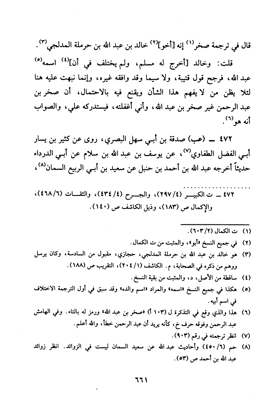 قَالَ فِي تَرْجَمَة صَخْر إِنَّه أَخُو خَالِد بن عبد الله بن حَرْمَلَة المدلجي قلت وخَالِد اخْرُج لَهُ مُسلم وَلم يخْتَلف فِي أَن اسْمه عبد الله فرجح قَول قُتَيْبَة وَلَا سِيمَا وَقد وَافقه غَيره وانما نبهت عَلَيْهِ هُنَا لِئَلَّا يظنّ من لَا يفهم هَذَا الشَّأْن ويقنع فِيهِ بِالِاحْتِمَالِ أَن صَخْر بن عبد الرَّحْمَن غير صَخْر بن عبد الله وَأَنِّي اغفلته فيستدركه عَليّ وَالصَّوَاب أَنه هُوَ