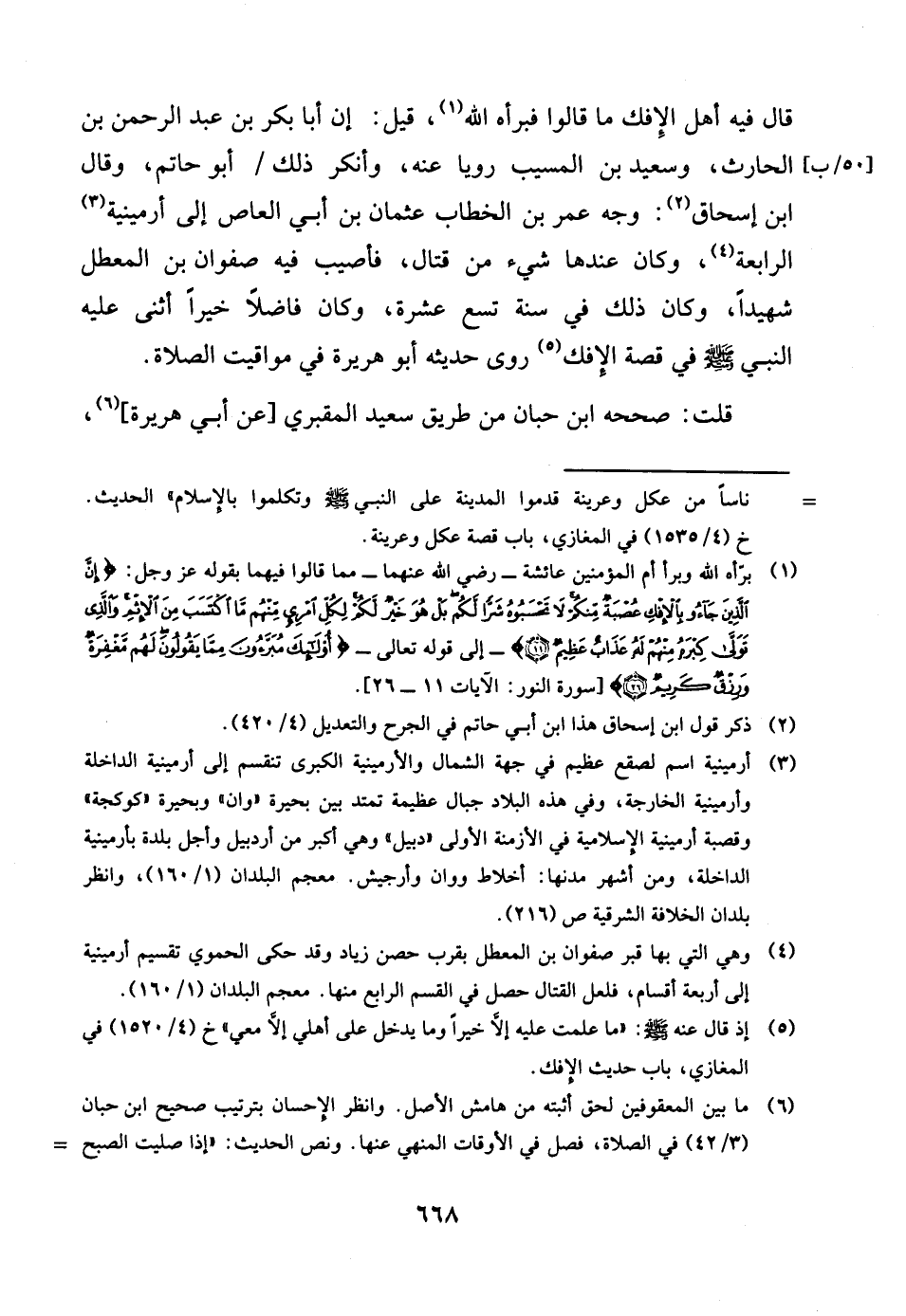 قَالَ فِيهِ أهل الْإِفْك مَا قَالُوا فبرأه الله قيل ان أَبَا بكر بن عبد الرَّحْمَن بن الْحَارِث وَسَعِيد بن الْمسيب رويا عَنهُ وَأنكر ذَلِك أَبُو حَاتِم وَقَالَ بن إِسْحَاق وَجه عمر بن الْخطاب عُثْمَان بن أبي الْعَاصِ الى أرمينية الرَّابِعَة وَكَانَ عِنْدهَا شَيْء من قتال فاصيب فِيهِ صَفْوَان بن الْمُعَطل شَهِيدا وَكَانَ ذَلِك فِي سنة تسع عشرَة وَكَانَ فَاضلا خيرا اثنى عَلَيْهِ النَّبِي صلى الله عَلَيْهِ وَسلم فِي قصَّة الْإِفْك روى حَدِيثه أَبُو هُرَيْرَة فِي مَوَاقِيت الصَّلَاة قلت صَححهُ بن حبَان من طَرِيق سعيد المَقْبُري عَن أبي هُرَيْرَة
