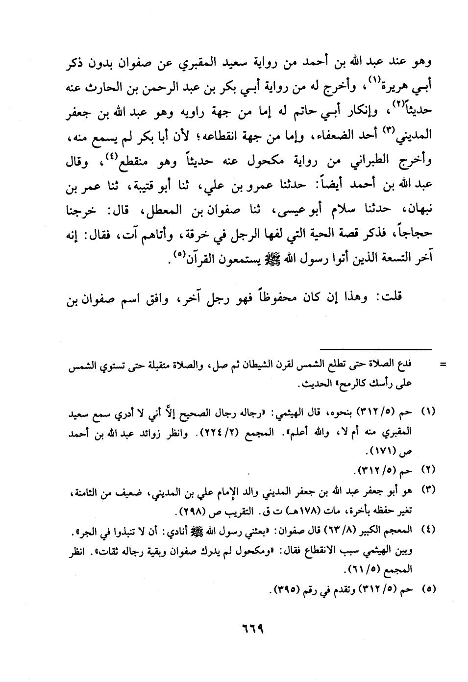 وَهُوَ عِنْد عبد الله بن أَحْمد من رِوَايَة سعيد المَقْبُري عَن صَفْوَان بِدُونِ ذكر أبي هُرَيْرَة واخرج لَهُ من رِوَايَة أبي بكر بن عبد الرَّحْمَن بن الْحَارِث عَنهُ حَدِيثا وانكار أبي حَاتِم لَهُ اما من جِهَة رَاوِيه وَهُوَ عبد الله بن جَعْفَر الْمَدِينِيّ أحد الضُّعَفَاء واما من جِهَة انْقِطَاعه لِأَن أَبَا بكر لم يسمع مِنْهُ واخرج الطَّبَرَانِيّ من رِوَايَة مَكْحُول عَنهُ حَدِيثا وَهُوَ مُنْقَطع وَقَالَ عبد الله بن أَحْمد أَيْضا حَدثنَا عَمْرو بن عَليّ ثَنَا أَبُو قُتَيْبَة ثَنَا عمر بن نَبهَان حَدثنَا سَلام أَبُو عِيسَى ثَنَا صَفْوَان بن الْمُعَطل قَالَ خرجنَا حجاجا فَذكر قصَّة الْحَيَّة الَّتِي لفها الرجل فِي خرقَة واتاهم آتٍ فَقَالَ إِنَّه آخر التِّسْعَة الَّذين اتوا رَسُول الله صلى الله عَلَيْهِ وَسلم يَسْتَمِعُون الْقُرْآن قلت وَهَذَا إِن كَانَ مَحْفُوظًا فَهُوَ رجل آخر وَافق اسْمه صَفْوَان بن