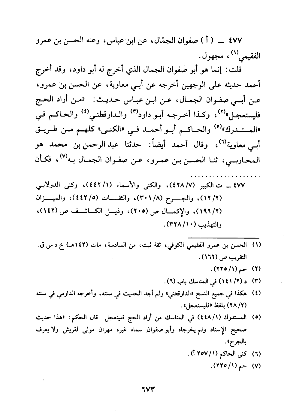 477 - اصَفْوَان الْجمال عَن بن عَبَّاس وَعنهُ الْحسن بن عَمْرو الْفُقيْمِي مَجْهُول قلت إِنَّمَا هُوَ أَبُو صَفْوَان الْجمال الَّذِي اخْرُج لَهُ أَبُو دَاوُد وَقد اخْرُج أَحْمد حَدِيثه على الْوَجْهَيْنِ أخرجه عَن أبي مُعَاوِيَة عَن الْحسن بن عَمْرو عَن أبي صَفْوَان الْجمال عَن بن عَبَّاس حَدِيث من أَرَادَ الْحَج فليستعجل وَكَذَا أخرجه أَبُو دَاوُد وَالدَّارَقُطْنِيّ وَالْحَاكِم فِي الْمُسْتَدْرك وَالْحَاكِم أَبُو أَحْمد فِي الكنى كلهم من طَرِيق أبي مُعَاوِيَة وَقَالَ أَحْمد أَيْضا حَدثنَا عبد الرَّحْمَن بن مُحَمَّد هُوَ الْمحَاربي ثَنَا الْحسن بن عَمْرو عَن صَفْوَان الْجمال بِهِ فَكَأَن