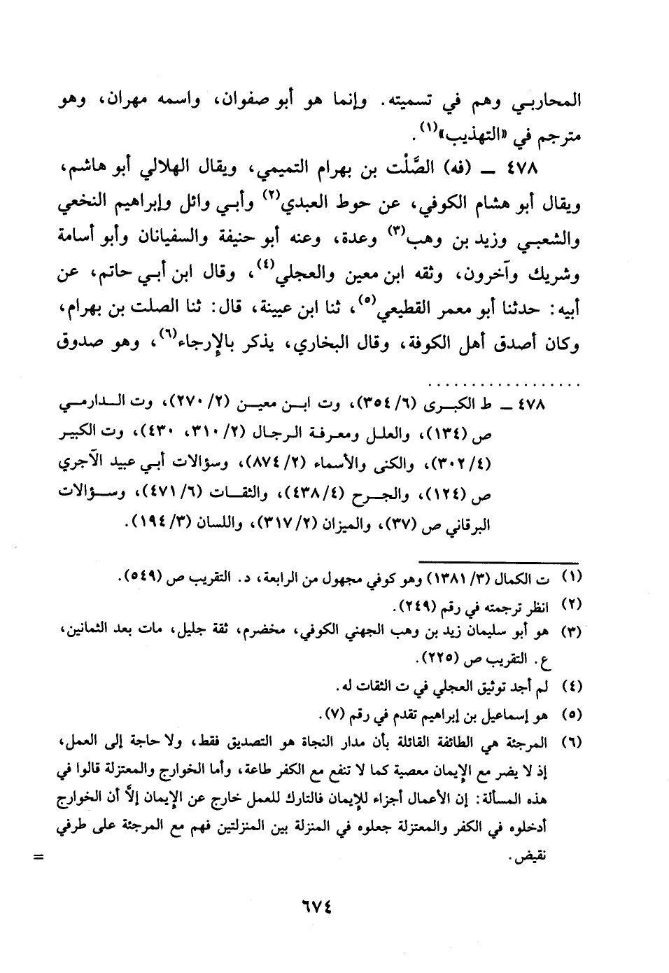 478 - فه الصَّلْت بن بهْرَام التَّمِيمِي وَيُقَال الْهِلَالِي أَبُو هَاشم وَيُقَال أَبُو هِشَام الْكُوفِي عَن حوط الْعَبْدي وَأبي وَائِل وَإِبْرَاهِيم النَّخعِيّ وَالشعْبِيّ وَزيد بن وهب وعدة وَعنهُ أَبُو حنيفَة والسفيانان وَأَبُو أُسَامَة وَشريك وَآخَرُونَ وَثَّقَهُ بن معِين وَالْعجلِي وَقَالَ بن أبي حَاتِم عَن أَبِيه حَدثنَا أَبُو معمر الْقطيعِي ثَنَا بن عُيَيْنَة قَالَ ثَنَا الصَّلْت بن بهْرَام وَكَانَ اصدق أهل الْكُوفَة وَقَالَ البُخَارِيّ يذكر بالإرجاء وَهُوَ صَدُوق