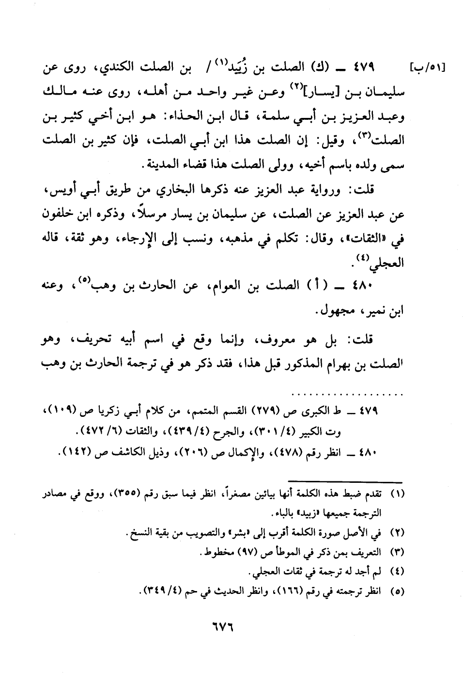 479 - ك الصَّلْت بن زبيد بن الصَّلْت الْكِنْدِيّ روى عَن سُلَيْمَان بن يسَار وَعَن غير وَاحِد من أَهله روى عَنهُ مَالك وَعبد الْعَزِيز بن أبي سَلمَة قَالَ بن الْحذاء هُوَ بن أخي كثير بن الصَّلْت وَقيل إِن الصَّلْت هَذَا بن أبي الصَّلْت فَإِن كثير بن الصَّلْت سمى وَلَده باسم أَخِيه وَولى الصَّلْت هَذَا قَضَاء الْمَدِينَة قلت وَرِوَايَة عبد الْعَزِيز عَنهُ ذكرهَا البُخَارِيّ من طَرِيق أبي أويس عَن عبد الْعَزِيز عَن الصَّلْت عَن سُلَيْمَان بن يسَار مُرْسلا وَذكره بن خلفون فِي الثِّقَات وَقَالَ تكلم فِي مذْهبه وَنسب الى الارجاء وَهُوَ ثِقَة قَالَه الْعجلِيّ