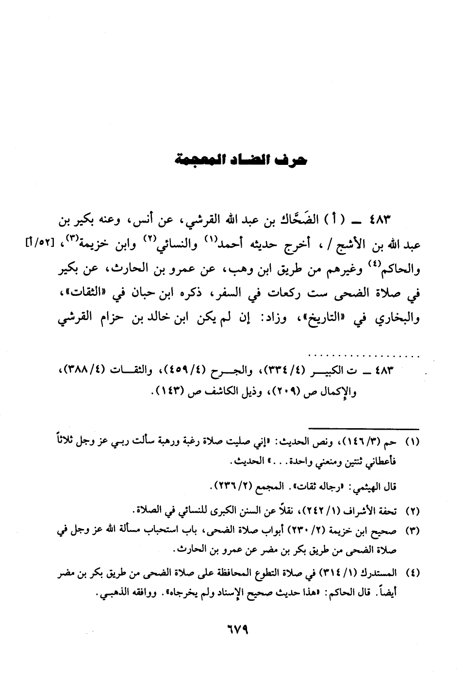483 - االضَّحَّاك بن عبد الله الْقرشِي عَن أنس وَعنهُ بكير بن عبد الله بن الْأَشَج اخْرُج حَدِيثه أَحْمد وَالنَّسَائِيّ وَابْن خُزَيْمَة وَالْحَاكِم وَغَيرهم من طَرِيق بن وهب عَن عَمْرو بن الْحَارِث عَن بكير فِي صَلَاة الضُّحَى سِتّ رَكْعَات فِي السّفر ذكره بن حبَان فِي الثِّقَات وَالْبُخَارِيّ فِي التَّارِيخ وَزَاد إِن لم يكن بن خَالِد بن حزَام الْقرشِي ا