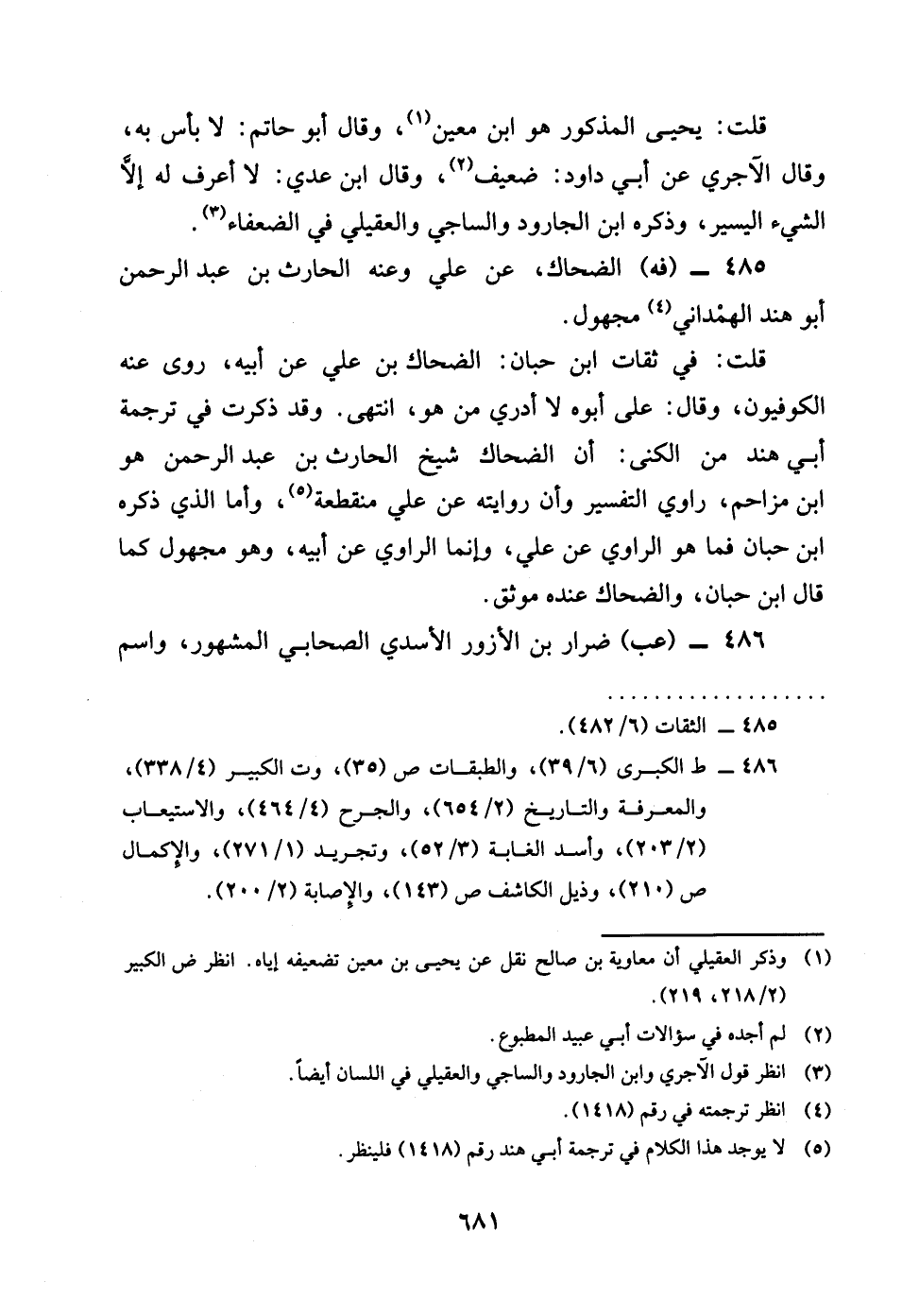 485 - فه الضَّحَّاك عَن عَليّ رضى الله تَعَالَى عَنهُ وَعنهُ الْحَارِث بن عبد الرَّحْمَن أَبُو هِنْد الْهَمدَانِي مَجْهُول قلت فِي ثِقَات بن حبَان الضَّحَّاك بن عَليّ عَن أَبِيه روى عَنهُ الْكُوفِيُّونَ وَقَالَ عَليّ أَبوهُ لَا أَدْرِي من هُوَ انْتهى وَقد ذكرت فِي تَرْجَمَة أبي هِنْد من الكنى أَن الضَّحَّاك شيخ الْحَارِث بن عبد الرَّحْمَن هُوَ بن مُزَاحم رَاوِي التَّفْسِير وَأَن رِوَايَته عَن عَليّ مُنْقَطِعَة واما الَّذِي ذكره بن حبَان فَمَا هُوَ الرَّاوِي عَن عَليّ وَإِنَّمَا الرواي عَن أَبِيه وَهُوَ مَجْهُول كَمَا قَالَ بن حبَان وَالضَّحَّاك عِنْده موثق