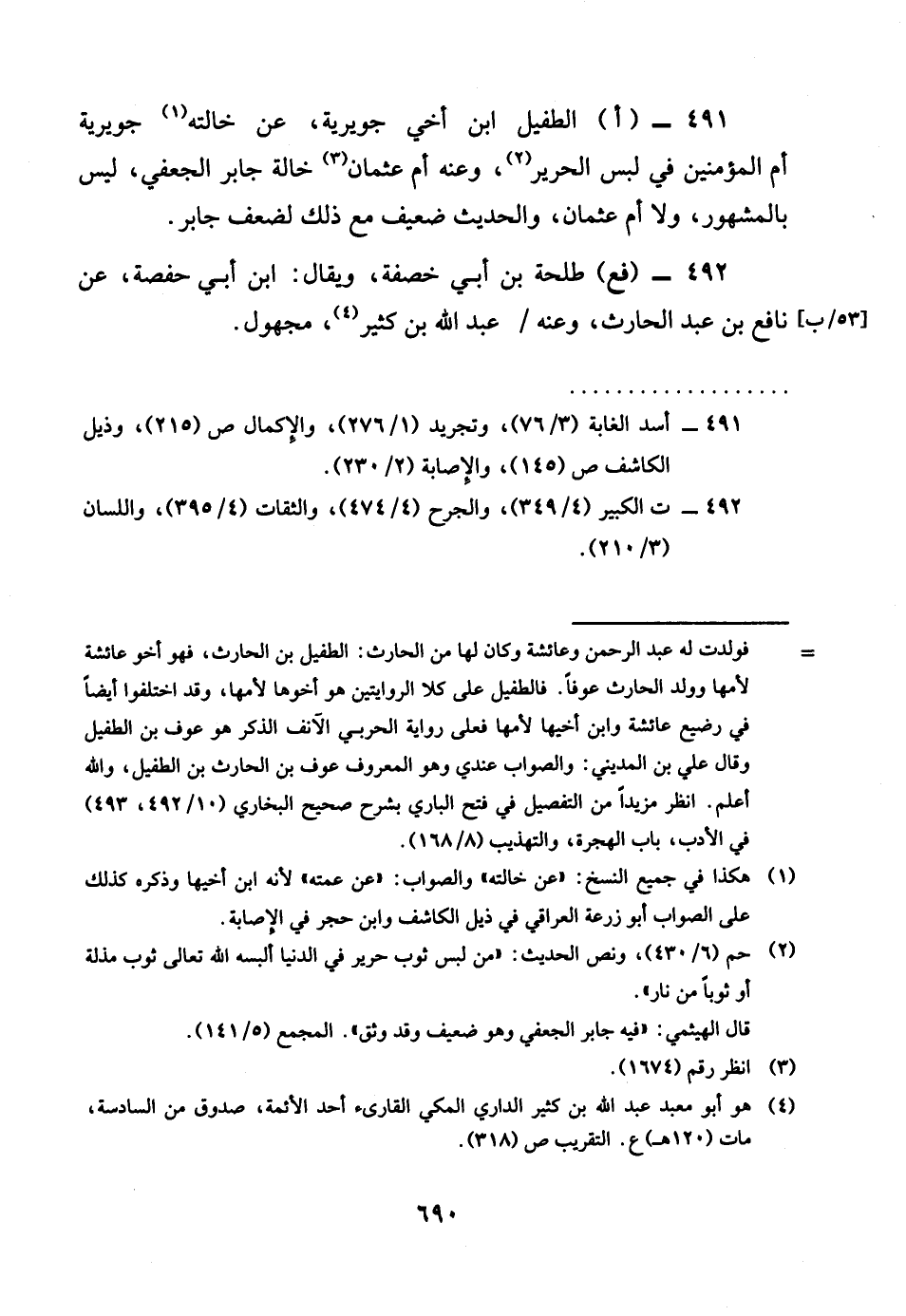 491 - االطُّفَيْل بن أخي جوَيْرِية عَن خَالَته جوَيْرِية أم الْمُؤمنِينَ فِي لبس الْحَرِير وَعنهُ أم عُثْمَان خَالَة جَابر الْجعْفِيّ لَيْسَ بالمشهور وَلَا أم عُثْمَان والْحَدِيث ضَعِيف مَعَ ذَلِك لضعف جَابر