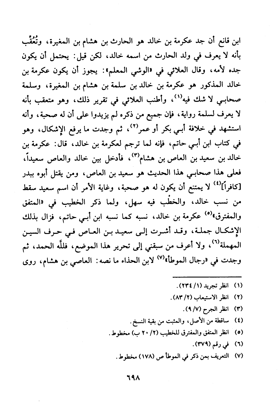بن قَانِع أَن جد عِكْرِمَة بن خَالِد هُوَ الْحَارِث بن هِشَام بن الْمُغيرَة وَتعقب بِأَنَّهُ لَا يعرف فِي ولد الْحَارِث من اسْمه خَالِد لَكِن قيل يحْتَمل أَن يكون جده لامه وَقَالَ العلائي فِي الوشي الْمعلم يجوز أَن يكون عِكْرِمَة بن خَالِد الْمَذْكُور هُوَ عِكْرِمَة بن خَالِد بن سَلمَة بن هِشَام بن الْمُغيرَة وَسَلَمَة صَحَابِيّ لَا شكّ فِيهِ واطنب العلائي فِي تَقْرِير ذَلِك وَهُوَ متعقب بِأَنَّهُ لَا يعرف لسَلمَة رِوَايَة فَإِن جَمِيع من ذكره لم يزِيدُوا على أَن لَهُ صُحْبَة وَأَنه اسْتشْهد فِي خلَافَة أبي بكر أَو عمر رضى الله تَعَالَى عَنْهُمَا ثمَّ وجدت مَا يرفع الاشكال وَهُوَ فِي كتاب بن أبي حَاتِم فَإِنَّهُ لما ترْجم لعكرمة بن خَالِد قَالَ عِكْرِمَة بن خَالِد بن سعيد بن الْعَاصِ بن هِشَام فَادْخُلْ بَين خَالِد وَالْعَاص سعيدا فعلى هَذَا صَحَابِيّ هَذَا الحَدِيث هُوَ سعيد بن الْعَاصِ وَمن يقتل أَبوهُ ببدر كَافِرًا لَا يمْتَنع أَن يكون لَهُ صُحْبَة وَغَايَة الْأَمر أَن اسْم سعيد سقط فِي نسب خَالِد والخطب فِيهِ سهل وَلما ذكر الْخَطِيب فِي الْمُتَّفق والمفترق عِكْرِمَة بن خَالِد نسبه كَمَا نسبه بن أبي حَاتِم فَزَالَ بذلك الاشكال جملَة وَقد أَشرت الى سعيد بن الْعَاصِ فِي حرف السِّين الْمُهْملَة وَلَا اعرف من سبقني الى تَحْرِير هَذَا الْموضع فَللَّه الْحَمد ثمَّ وجدت فِي رجال الْمُوَطَّأ لِابْنِ الْحذاء مَا نَصه العَاصِي بن هِشَام روى