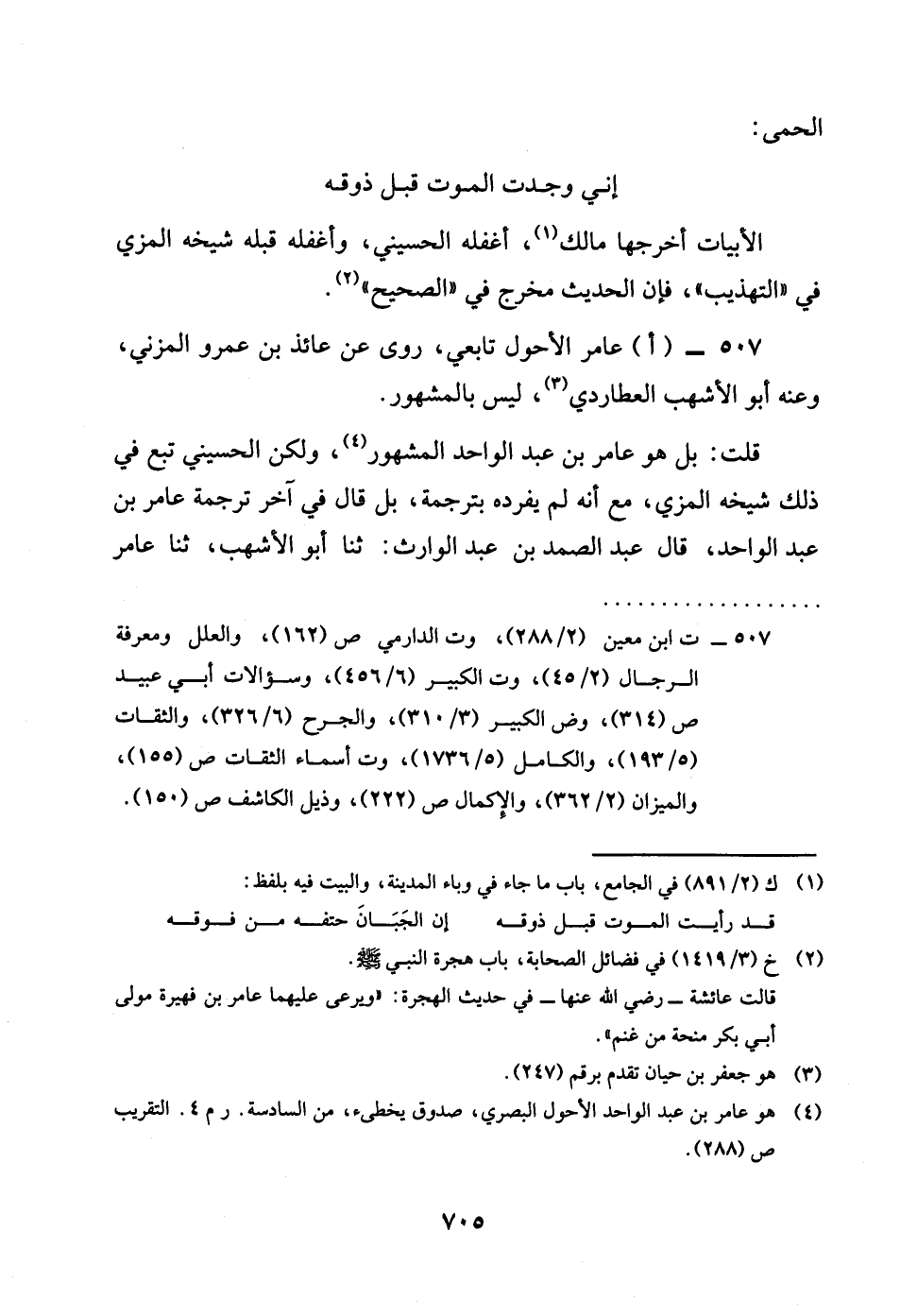 507 - عَامر الْأَحول تَابِعِيّ روى عَن عَائِذ بن عَمْرو الْمُزنِيّ وَعنهُ أَبُو الْأَشْهب العطاردي لَيْسَ بالمشهور قلت بل هُوَ عَامر بن عبد الْوَاحِد الْمَشْهُور وَلَكِن الْحُسَيْنِي تبع فِي ذَلِك شَيْخه الْمزي مَعَ أَنه لم يفرده بترجمة بل قَالَ فِي آخر تَرْجَمَة عَامر بن عبد الْوَاحِد قَالَ عبد الصَّمد بن عبد الْوَارِث ثَنَا أَبُو الْأَشْهب ثَنَا عَامر