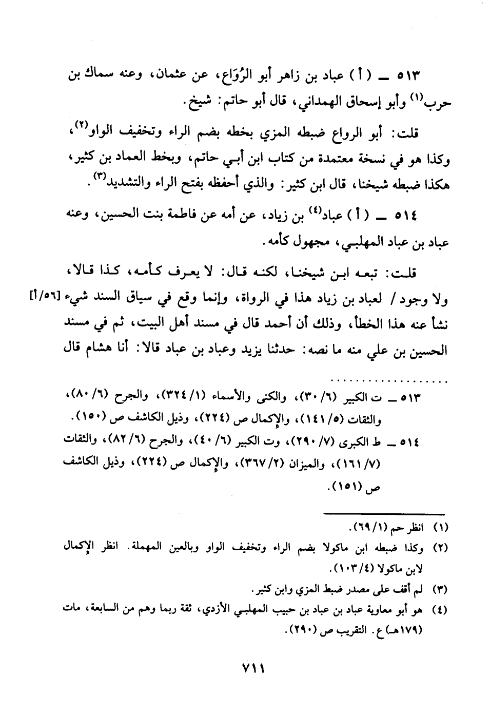 513 - اعباد بن زَاهِر أَبُو الرواع عَن عُثْمَان وَعنهُ سماك بن حَرْب وَأَبُو إِسْحَاق الْهَمدَانِي قَالَ أَبُو حَاتِم شيخ قلت أَبُو الرواع ضَبطه الْمزي بِخَطِّهِ بِضَم الرَّاء وَتَخْفِيف الْوَاو وَكَذَا هُوَ فِي نُسْخَة مُعْتَمدَة من كتاب بن أبي حَاتِم وبخط الْعِمَاد بن كثير هَكَذَا ضَبطه شَيخنَا قَالَ بن كثير وَالَّذِي احفظه بِفَتْح الرَّاء وَالتَّشْدِيد