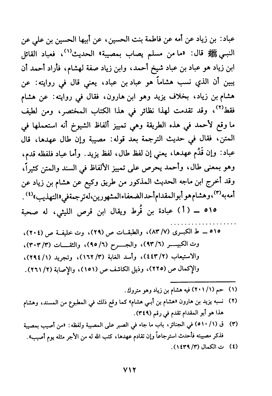 عباد بن زِيَاد عَن أمه عَن فَاطِمَة بنت الْحُسَيْن عَن أَبِيهَا الْحُسَيْن بن عَليّ عَن النَّبِي صلى الله عَلَيْهِ وَسلم قَالَ مَا من مُسلم يصاب بمصيبة الحَدِيث فَعبَّاد الْقَائِل بن زِيَاد هُوَ عباد بن عباد شيخ أَحْمد وَابْن زِيَاد صفة لهشأم فَأَرَادَ أَحْمد أَن يبين أَن الَّذِي نسب هشاما هُوَ عباد بن عباد يَعْنِي قَالَ فِي رِوَايَته عَن هِشَام بن زِيَاد بِخِلَاف يزِيد وَهُوَ بن هَارُون فَقَالَ فِي رِوَايَته عَن هِشَام فَقَط وَقد تقدّمت لهَذَا نَظَائِر فِي هَذَا الْكتاب الْمُخْتَصر وَمن لطيف مَا وَقع لِأَحْمَد فِي هَذِه الطَّرِيقَة وَهِي تَمْيِيز أَلْفَاظ الشُّيُوخ أَنه استعملها فِي الْمَتْن فَقَالَ فِي حَدِيث التَّرْجَمَة بعد قَوْله مُصِيبَة وَإِن طَال عهدها قَالَ عباد وَإِن قدم عهدها يَعْنِي أَن لفظ قَالَ لفظ يزِيد وَأما عباد فلفظه قدم وَهُوَ بِمَعْنى طَال وَأحمد يحرص على تَمْيِيز الْأَلْفَاظ فِي السَّنَد والمتن كثيرا وَقد أخرج بن ماجة الحَدِيث الْمَذْكُور من طَرِيق وَكِيع عَن هِشَام بن زِيَاد عَن أمه بِهِ وَهِشَام هُوَ أَبُو الْمِقْدَام أحد الضُّعَفَاء الْمَشْهُورين لَهُ تَرْجَمَة فِي التَّهْذِيب