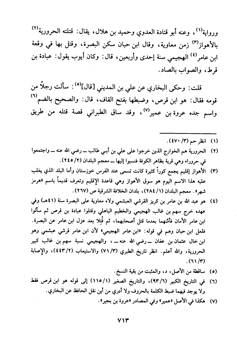 وَرِوَايَة وَعنهُ أَبُو قَتَادَة الْعَدوي وَحميد بن هِلَال يُقَال قتلته الحرورية بالأهواز زمن مُعَاوِيَة وَقَالَ بن حبَان سكن الْبَصْرَة وَقتل بهَا فِي وقْعَة بن عَامر الهُجَيْمِي سنة إِحْدَى وَأَرْبَعين قَالَ وَكَانَ أَيُّوب يَقُول عبَادَة بن قرط وَالصَّوَاب بالصَّاد قلت وَحكي البُخَارِيّ عَن عَليّ بن الْمَدِينِيّ قَالَ سَأَلت رجلا من قومه فَقَالَ هُوَ بن قرص وضبطها بِفَتْح الْقَاف وَقَالَ وَالصَّحِيح بِالضَّمِّ وَاسم جده عُرْوَة بن عُمَيْر وَقد سَاق الطَّبَرَانِيّ قصَّة قَتله من طَرِيق
