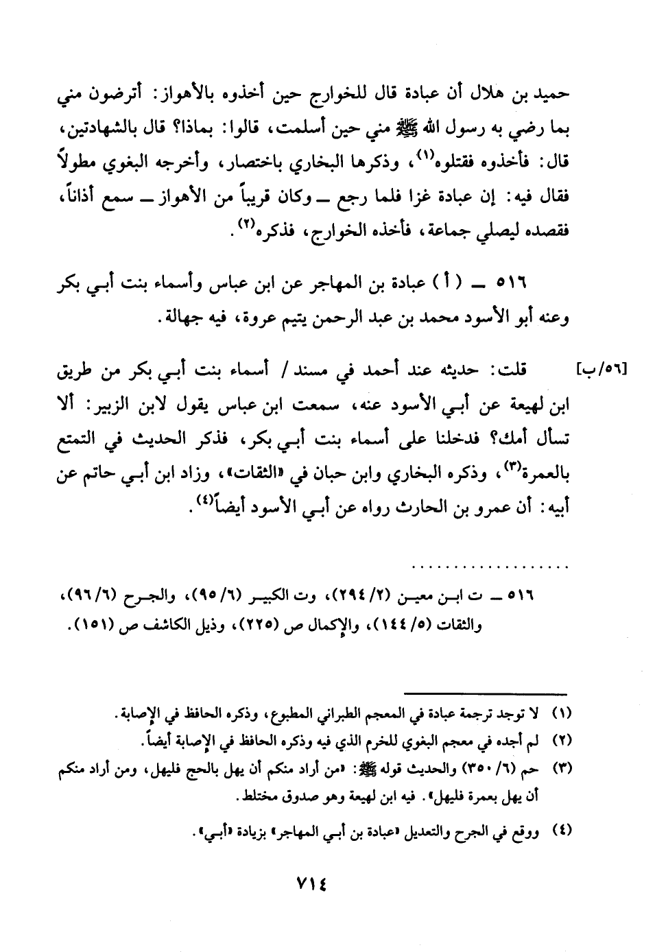 516 - اعبَادَة بن المُهَاجر عَن بن عَبَّاس وَأَسْمَاء بنت أبي بكر رضى الله تَعَالَى عَنْهُم وَعنهُ أَبُو الْأسود مُحَمَّد بن عبد الرَّحْمَن يَتِيم عُرْوَة فِيهِ جَهَالَة قلت حَدِيثه عِنْد أَحْمد فِي مُسْند أَسمَاء بنت أبي بكر من طَرِيق بن لَهِيعَة عَن أبي الْأسود عَنهُ سَمِعت بن عَبَّاس يَقُول لِابْنِ الزبير أَلا تسْأَل أمك فَدَخَلْنَا على أَسمَاء بنت أبي بكر فَذكر الحَدِيث فِي التَّمَتُّع بِالْعُمْرَةِ وَذكره البُخَارِيّ وَابْن حبَان فِي الثِّقَات وَزَاد بن أبي حَاتِم عَن أَبِيه أَن عَمْرو بن الْحَارِث رَوَاهُ عَن أبي الْأسود أَيْضا