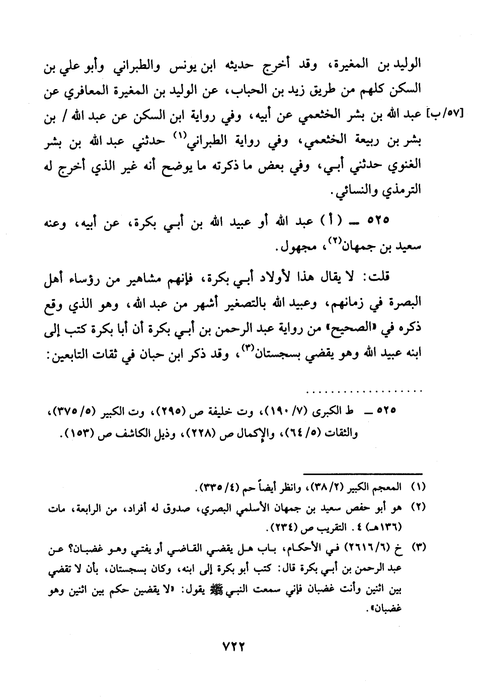 525 - اعبد الله أَو عبيد الله بن أبي بكرَة عَن أَبِيه وَعنهُ سعيد بن جمْهَان مَجْهُول قلت لَا يُقَال هَذَا لأَوْلَاد أبي بكرَة فَإِنَّهُم مشاهير من رُؤَسَاء أهل الْبَصْرَة فِي زمانهم وَعبيد الله بِالتَّصْغِيرِ أشهر من عبد الله وَهُوَ الَّذِي وَقع ذكره فِي الصَّحِيح من رِوَايَة عبد الرَّحْمَن بن أبي بكرَة أَن أَبَا بكرَة كتب إِلَى ابْنه عبيد الله وَهُوَ يقْضِي بسجستان وَقد ذكر بن حبَان فِي ثِقَات التَّابِعين