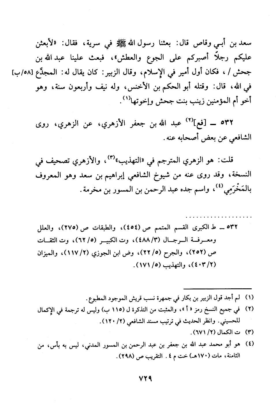 532 - فع عبد الله بن جَعْفَر الْأَزْهَرِي عَن الزُّهْرِيّ روى الشَّافِعِي عَن بعض أَصْحَابه عَنهُ قلت هُوَ الزُّهْرِيّ المترجم فِي التَّهْذِيب والأزهري تَصْحِيف فِي النُّسْخَة وَقد روى عَنهُ من شُيُوخ الشَّافِعِي إِبْرَاهِيم بن سعد وَهُوَ الْمَعْرُوف بالمخرمي وَاسم جده عبد الرَّحْمَن بن الْمسور بن مخرمَة