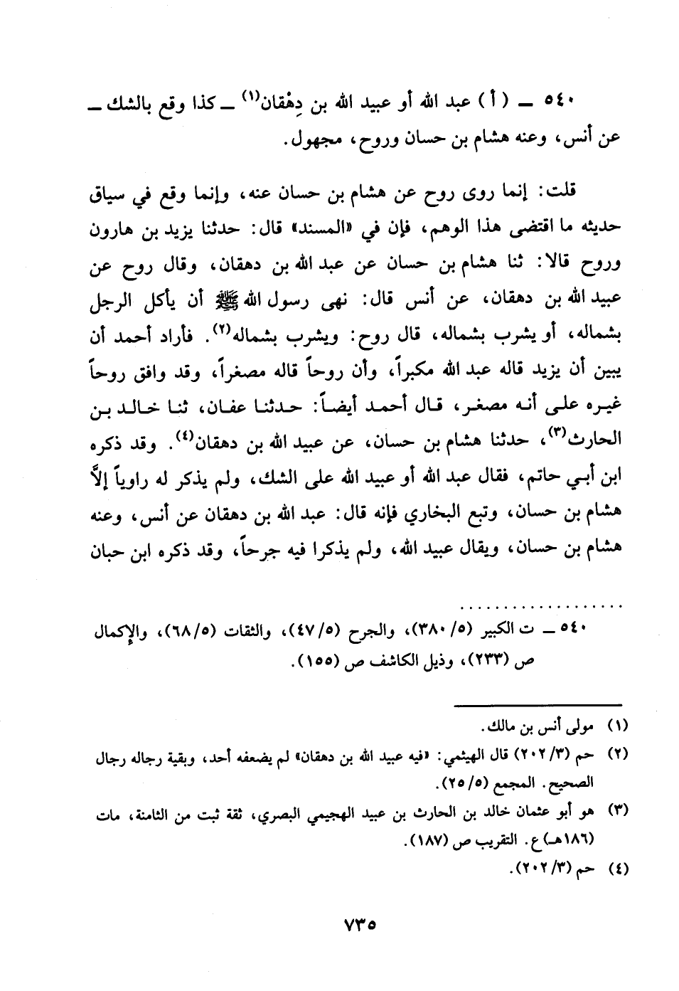 540 - اعبد الله أَو عبيد الله بن دهقان كَذَا وَقع بِالشَّكِّ عَن أنس وَعنهُ هِشَام بن حسان وروح مَجْهُول قلت إِنَّمَا روى روح عَن هِشَام بن حسان عَنهُ وَإِنَّمَا وَقع فِي سِيَاق حَدِيثه مَا اقْتضى هَذَا الْوَهم فَإِن فِي الْمسند قَالَ حَدثنَا يزِيد بن هَارُون وروح قَالَا ثَنَا هِشَام بن حسان عَن عبد الله بن دهقان وَقَالَ روح عَن عبيد الله بن دهقان عَن أنس قَالَ نهى رَسُول الله صلى الله عَلَيْهِ وَسلم أَن يَأْكُل الرجل بِشمَالِهِ أَو يشرب بِشمَالِهِ قَالَ روح وَيشْرب بِشمَالِهِ فَأَرَادَ أَحْمد أَن يبين أَن يزِيد قَالَه عبد الله مكبرا وَأَن روحا قَالَه مُصَغرًا وَقد وَافق روحا غَيره على أَنه مصغر قَالَ أَحْمد أَيْضا حَدثنَا عَفَّان ثَنَا خَالِد بن الْحَارِث حَدثنَا هِشَام بن حسان عَن عبيد الله بن دهقان وَقد ذكره بن أبي حَاتِم فَقَالَ عبد الله أَو عبيد الله على الشَّك وَلم يذكر لَهُ رَاوِيا إِلَّا هِشَام بن حسان وَتبع البُخَارِيّ فَإِنَّهُ قَالَ عبد الله بن دهقان عَن أنس وَعنهُ هِشَام بن حسان وَيُقَال عبيد الله وَلم يذكرَا فِيهِ جرحا وَقد ذكره بن حبَان