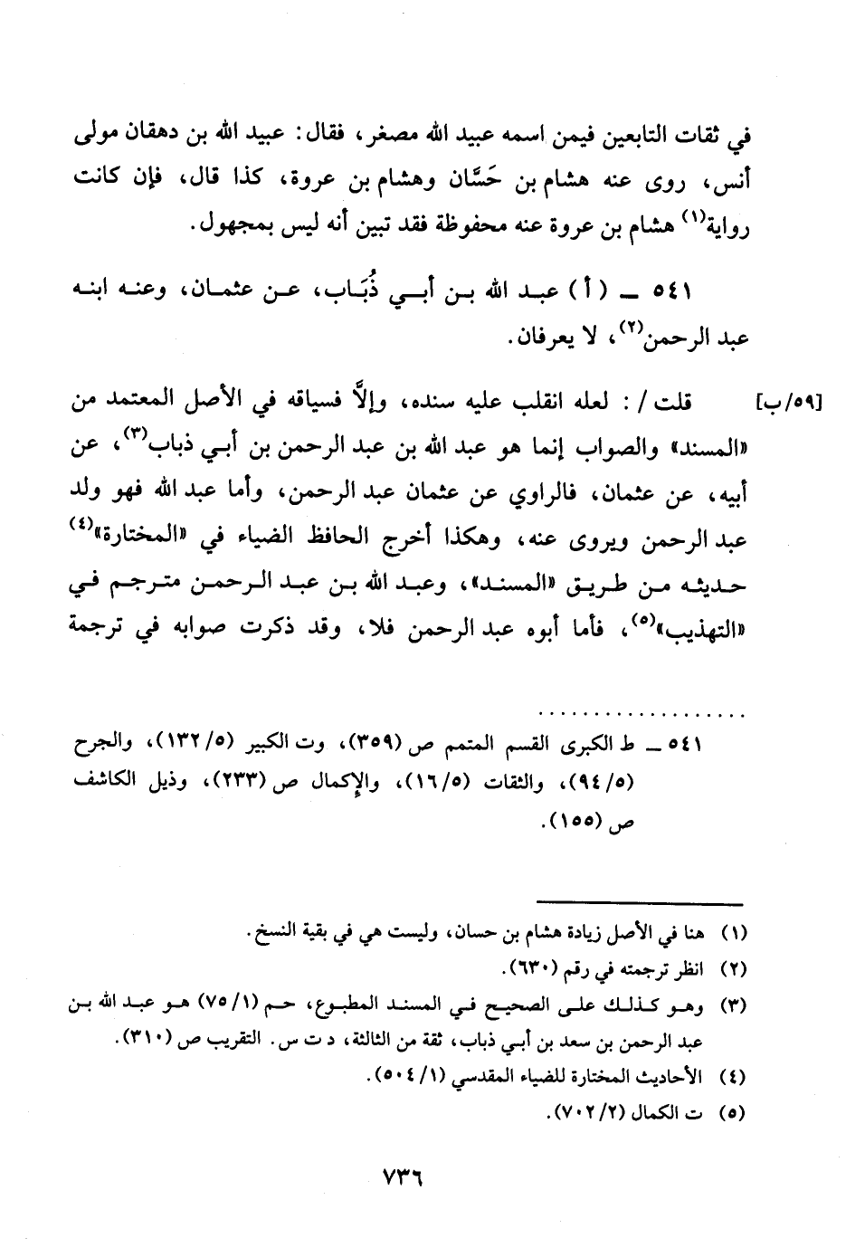 541 - اعبد الله بن أبي ذُبَاب عَن عُثْمَان رضى الله تَعَالَى عَنهُ وَعنهُ ابْنه عبد الرَّحْمَن لَا يعرفان قلت لَعَلَّه انْقَلب عَلَيْهِ سَنَده وَإِلَّا فسياقه فِي الأَصْل الْمُعْتَمد من الْمسند وَالصَّوَاب إِنَّمَا هُوَ عبد الله بن عبد الرَّحْمَن بن أبي ذُبَاب عَن أَبِيه عَن عُثْمَان فالراوي عَن عُثْمَان عبد الرَّحْمَن وَأما عبد الله فَهُوَ ولد عبد الرَّحْمَن ويروي عَنهُ وَهَكَذَا اخْرُج الْحَافِظ الضياء فِي المختارة حَدِيثه من طَرِيق الْمسند وَعبد الله بن عبد الرَّحْمَن مترجم فِي التَّهْذِيب فَأَما أَبوهُ عبد الرَّحْمَن فَلَا وَقد ذكرت صَوَابه فِي تَرْجَمَة