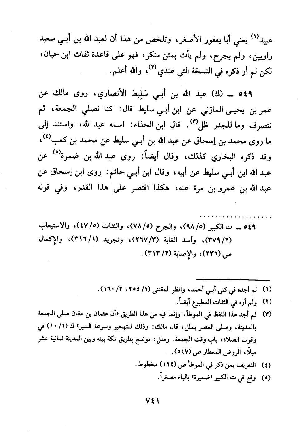 549 - ك عبد الله بن أبي سليط الْأنْصَارِيّ روى مَالك عَن عمر بن يحيى الْمَازِني عَن بن أبي سليط قَالَ كُنَّا نصلي الْجُمُعَة ثمَّ ننصرف وَمَا للجدر ظلّ قَالَ بن الْحذاء اسْمه عبد الله واستند إِلَى مَا روى مُحَمَّد بن إِسْحَاق عَن عبد الله بن أبي سليط عَن مُحَمَّد بن كَعْب وَقد ذكره البُخَارِيّ كَذَلِك وَقَالَ أَيْضا روى عبد الله بن ضَمرَة عَن عبد الله بن أبي سليط عَن أَبِيه وَقَالَ بن أبي حَاتِم روى بن إِسْحَاق عَن عبد الله بن عَمْرو بن مرّة عَنهُ هَكَذَا اقْتصر على هَذَا الْقدر وَفِي قَوْله