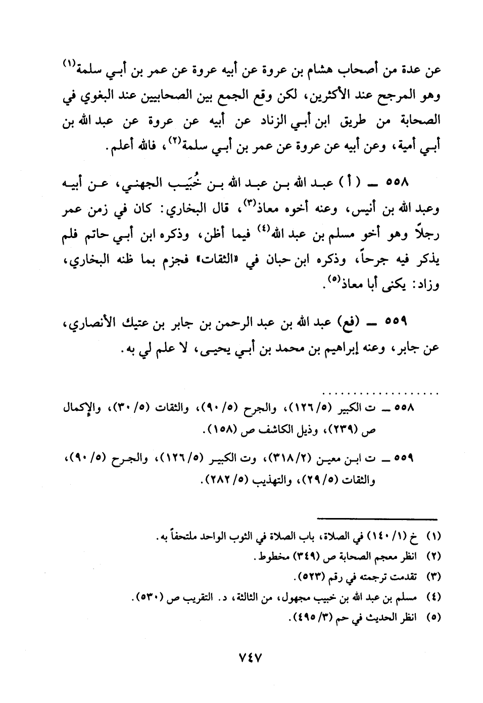 558 - اعبد الله بن عبد الله بن خبيب الْجُهَنِيّ عَن أَبِيه وَعبد الله بن أنيس وَعنهُ أَخُوهُ معَاذ قَالَ البُخَارِيّ كَانَ فِي زمن عمر رجلا وَهُوَ أَخُو مُسلم بن عبد الله فِيمَا أَظن وَذكره بن أبي حَاتِم فَلم يذكر فِيهِ جرحا وَذكره بن حبَان فِي الثِّقَات فَجزم بِمَا ظَنّه البُخَارِيّ وَزَاد يكنى أَبَا معَاذ