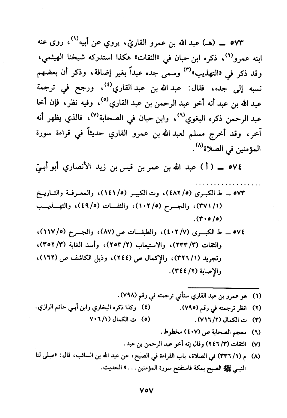 573 - هـ عبد الله بن عَمْرو الْقَارِي يروي عَن أَبِيه روى عَنهُ ابْنه عَمْرو ذكره بن حبَان فِي الثِّقَات هَكَذَا استدركه شَيخنَا الهيثمي وَقد ذكره فِي التَّهْذِيب وسمى جده عبدا بِغَيْر إِضَافَة وَذكر أَن بضعهم نسبه إِلَى جده فَقَالَ عبد الله بن عبد القارىء وَرجح فِي تَرْجَمَة عبد الله بن عبد أَنه أَخُو عبد الرَّحْمَن بن عبد الْقَارِي وَفِيه نظر فَإِن أَخا عبد الرَّحْمَن ذكره الْبَغَوِيّ وَابْن حبَان فِي الصَّحَابَة فَالَّذِي يظْهر أَنه آخر وَقد أخرج مُسلم لعبد الله بن عَمْرو الْقَارِي حَدِيثا فِي قِرَاءَة سُورَة الْمُؤمنِينَ فِي الصَّلَاة