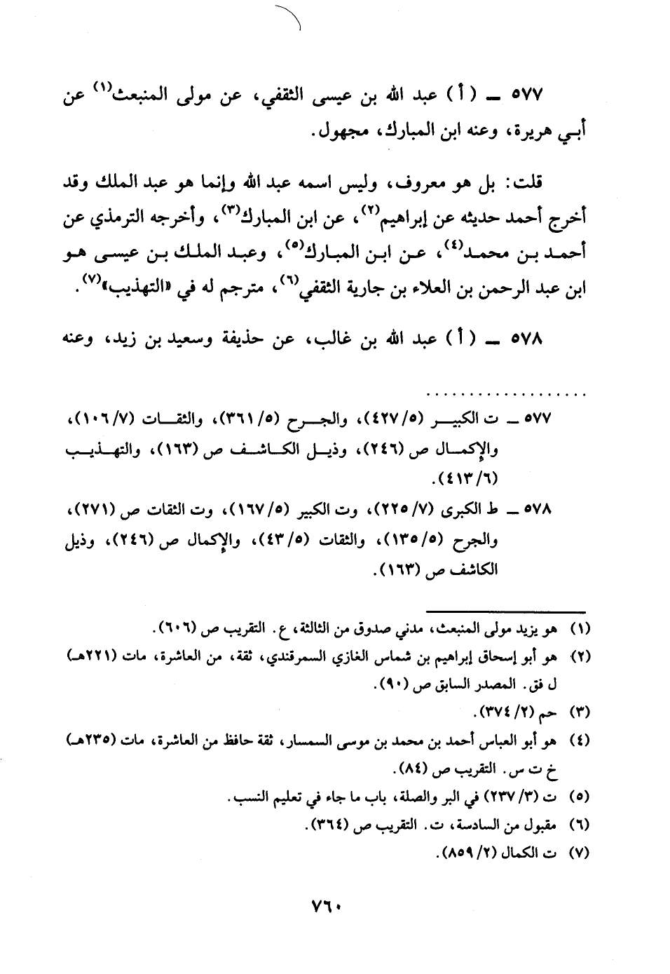 577 - اعبد الله بن عِيسَى الثَّقَفِيّ عَن مولى المنبعث عَن أبي هُرَيْرَة رضى الله تَعَالَى عَنهُ وَعنهُ بن الْمُبَارك مَجْهُول قلت بل هُوَ مَعْرُوف وَلَيْسَ اسْمه عبد الله وَإِنَّمَا هُوَ عبد الْملك وَقد أخرج أَحْمد حَدِيثه عَن إِبْرَاهِيم عَن بن الْمُبَارك وَأخرجه التِّرْمِذِيّ عَن أَحْمد بن مُحَمَّد عَن بن الْمُبَارك وَعبد الْملك بن عِيسَى هُوَ بن عبد الرَّحْمَن بن الْعَلَاء بن جَارِيَة الثَّقَفِيّ مترجم لَهُ فِي التَّهْذِيب