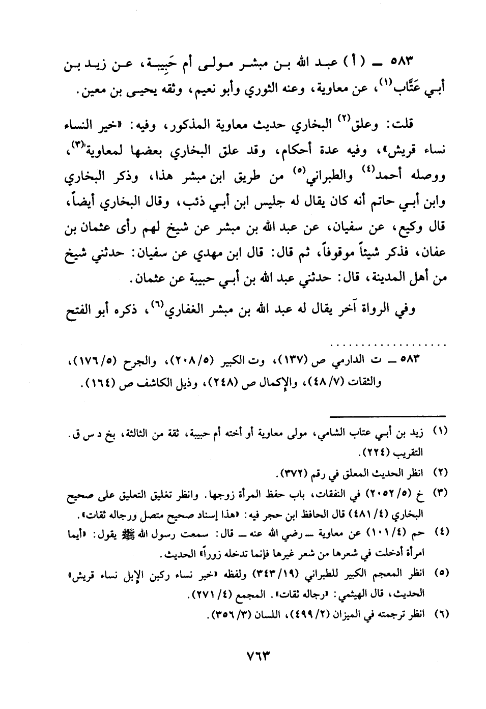 583 - اعبد الله بن مُبشر مولى أم حَبِيبَة رضى الله تَعَالَى عَنْهَا عَن زيد بن عتاب عَن مُعَاوِيَة وَعنهُ الثَّوْريّ وَأَبُو نعيم وَثَّقَهُ يحيى بن معِين قلت وعلق البُخَارِيّ حَدِيث مُعَاوِيَة الْمَذْكُور وَفِيه خير النِّسَاء نسَاء قُرَيْش وَفِيه عدَّة أحكأم وَقد علق البُخَارِيّ بَعْضهَا لمعاوية وَوَصله أَحْمد وَالطَّبَرَانِيّ من طَرِيق بن مُبشر هَذَا وَذكر البُخَارِيّ وَابْن أبي حَاتِم أَنه كَانَ يُقَال لَهُ جليس بن أبي ذِئْب وَقَالَ البُخَارِيّ أَيْضا قَالَ وَكِيع عَن سُفْيَان عَن عبد الله بن مُبشر عَن شيخ لَهُم رأى عُثْمَان بن عَفَّان رضى الله تَعَالَى عَنهُ فَذكر شَيْئا مَوْقُوفا ثمَّ قَالَ قَالَ بن مهْدي عَن سُفْيَان حَدثنِي شيخ من أهل الْمَدِينَة قَالَ حَدثنِي عبد الله بن أبي حَبِيبَة عَن عُثْمَان وَفِي الروَاة آخر يُقَال لَهُ عبد الله بن مُبشر الْغِفَارِيّ ذكره أَبُو الْفَتْح