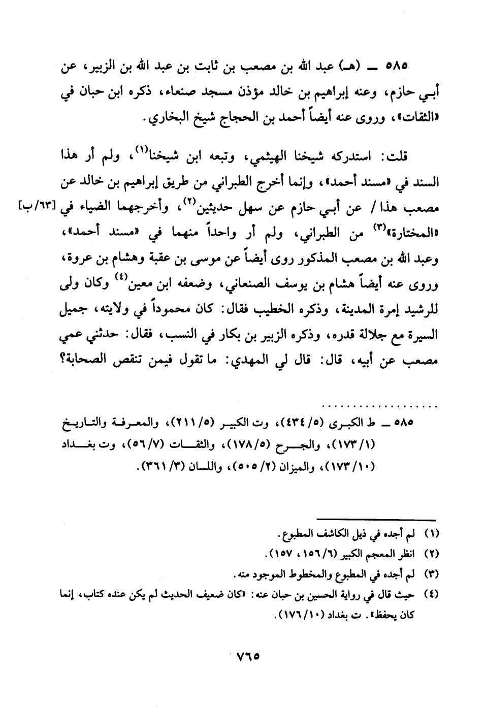 585 - هـ عبد الله بن مُصعب بن ثَابت بن عبد الله بن الزبير عَن أبي حَازِم وَعنهُ إِبْرَاهِيم بن خَالِد مُؤذن مَسْجِد صنعاء ذكره بن حبَان فِي الثِّقَات وروى عَنهُ أَيْضا أَحْمد بن الْحجَّاج شيخ البُخَارِيّ قلت استدركه شَيخنَا الهيثمي وَتَبعهُ بن شَيخنَا وَلم أر هَذَا السَّنَد فِي مُسْند أَحْمد وَإِنَّمَا أخرج الطَّبَرَانِيّ من طَرِيق إِبْرَاهِيم بن خَالِد عَن بن مُصعب هَذَا عَن أبي حَازِم عَن سهل حديثين وأخرجهما الضياء فِي المختارة من الطَّبَرَانِيّ وَلم أر أحدا مِنْهُمَا فِي مُسْند أَحْمد وَعبد الله بن مُصعب الْمَذْكُور روى أَيْضا عَن مُوسَى بن عقبَة وَهِشَام بن عُرْوَة وروى عَنهُ أَيْضا هِشَام بن يُوسُف الصَّنْعَانِيّ وَضَعفه بن معِين وَكَانَ ولى للرشيد أمرة الْمَدِينَة وَذكره الْخَطِيب فَقَالَ كَانَ مَحْمُودًا فِي ولَايَته جميل السِّيرَة مَعَ جلالة قدره وَذكره الزبير بن بكار فِي النّسَب فَقَالَ حَدثنِي عمي مُصعب عَن أَبِيه قَالَ قَالَ الْمهْدي مَا تَقول فِيمَن تنقص الصَّحَابَة