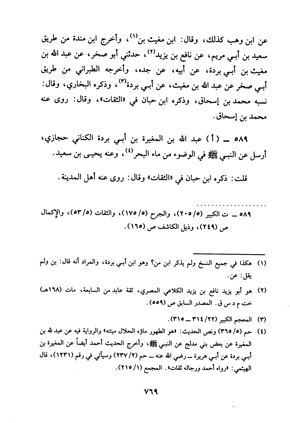 589 - اعبد الله بن الْمُغيرَة بن أبي بردة الْكِنَانِي حجازي أرسل عَن النَّبِي صلى الله عَلَيْهِ وَسلم فِي الْوضُوء من مَاء الْبَحْر وَعنهُ يحيى بن سعيد قلت ذكره بن حبَان فِي الثِّقَات وَقَالَ روى عَنهُ أهل الْمَدِينَة