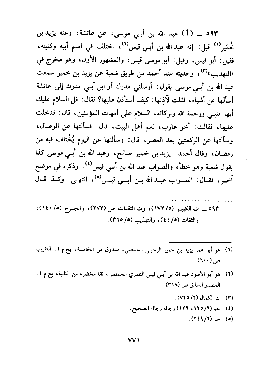 593 - اعبد الله بن أبي مُوسَى عَن عَائِشَة رضى الله تَعَالَى عَنْهَا وَعنهُ يزِيد بن خمير قيل أَنه عبد الله بن أبي قيس اخْتلف فِي اسْم أَبِيه وكنيته فَقيل أَبُو قيس وَقيل أَبُو مُوسَى قيس وَالْمَشْهُور الأول وَهُوَ مخرج فِي التَّهْذِيب وَحَدِيثه عِنْد أَحْمد من طَرِيق شُعْبَة عَن يزِيد بن خمير سَمِعت عبد الله بن أبي مُوسَى يَقُول أَرْسلنِي مدرك أَو بن أبي مدرك إِلَى عَائِشَة رضى الله تَعَالَى عَنْهَا أسألها عَن أَشْيَاء فَقلت لآذنها كَيفَ اسْتَأْذن عَلَيْهَا فَقَالَ قل السَّلَام عَلَيْك أَيهَا النَّبِي وَرَحْمَة الله وَبَرَكَاته السَّلَام على أُمَّهَات الْمُؤمنِينَ قَالَ فَدخلت عَلَيْهَا فَقَالَت أَخُو عَازِب نعم أهل الْبَيْت قَالَ فسألتها عَن الْوِصَال وسألتها عَن الرَّكْعَتَيْنِ بعد الْعَصْر قَالَ وسألتها عَن الْيَوْم يخْتَلف فِيهِ من رَمَضَان وَقَالَ أَحْمد يزِيد بن خمير صَالح وَعبد الله بن أبي مُوسَى كَذَا يَقُول شُعْبَة وَهُوَ خطأ وَالصَّوَاب عبد الله بن أبي قيس وَذكره فِي مَوضِع آخر فَقَالَ الصَّوَاب عبد الله بن أبي قيس انْتهى وَكَذَا قَالَ