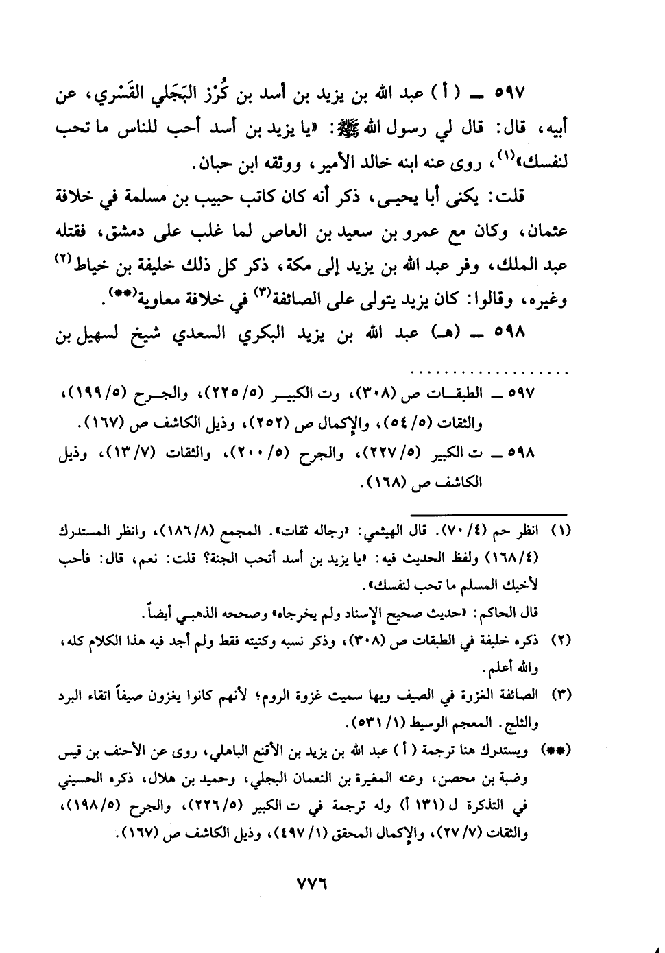 597 - اعبد الله بن يزِيد بن أَسد بن كرز البَجلِيّ الْقَسرِي عَن أَبِيه قَالَ قَالَ لي رَسُول الله صلى الله عَلَيْهِ وَسلم يَا يزِيد بن أَسد أحب للنَّاس مَا تحب لنَفسك روى عَنهُ ابْنه خَالِد الْأَمِير وَوَثَّقَهُ بن حبَان قلت يكنى أَبَا يحيى ذكر أَنه كَانَ كَاتب حبيب بن مسلمة فِي خلَافَة عُثْمَان رضى الله تَعَالَى عَنهُ وَكَانَ مَعَ عَمْرو بن سعيد بن الْعَاصِ لما غلب على دمشق فَقتله عبد الْملك وفر عبد الله بن يزِيد إِلَى مَكَّة ذكر كل ذَلِك خَليفَة بن خياط وَغَيره وَقَالُوا كَانَ يزِيد يتَوَلَّى على الصائفة فِي خلَافَة مُعَاوِيَة