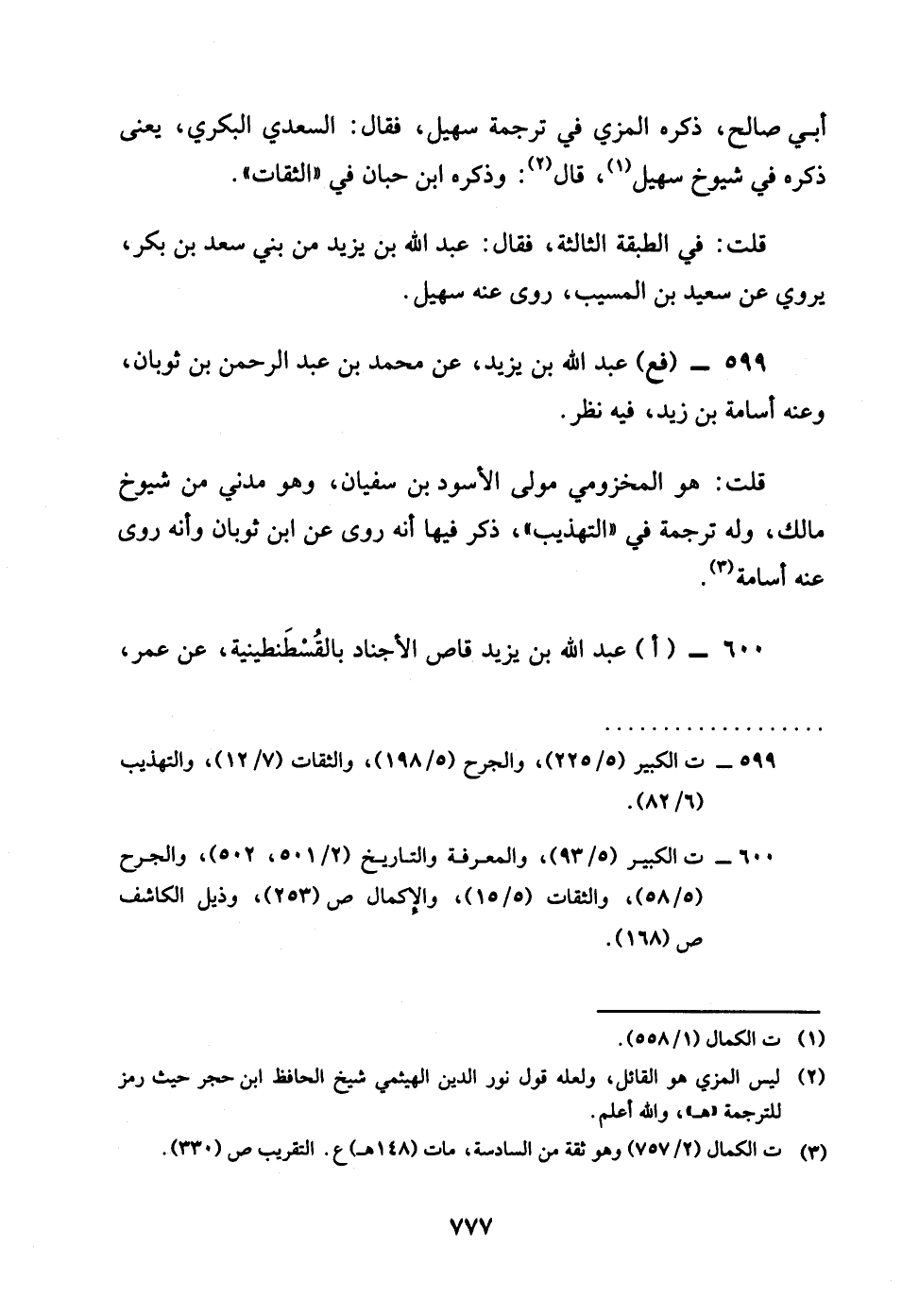 599 - فع عبد الله بن يزِيد عَن مُحَمَّد بن عبد الرَّحْمَن بن ثَوْبَان وَعنهُ أُسَامَة بن زيد فِيهِ نظر قلت هُوَ المَخْزُومِي مولى الْأسود بن سُفْيَان وَهُوَ مدنِي من شُيُوخ مَالك وَله تَرْجَمَة فِي التَّهْذِيب ذكر فِيهَا أَنه روى عَن بن ثَوْبَان وَأَنه روى عَنهُ أسَامَه