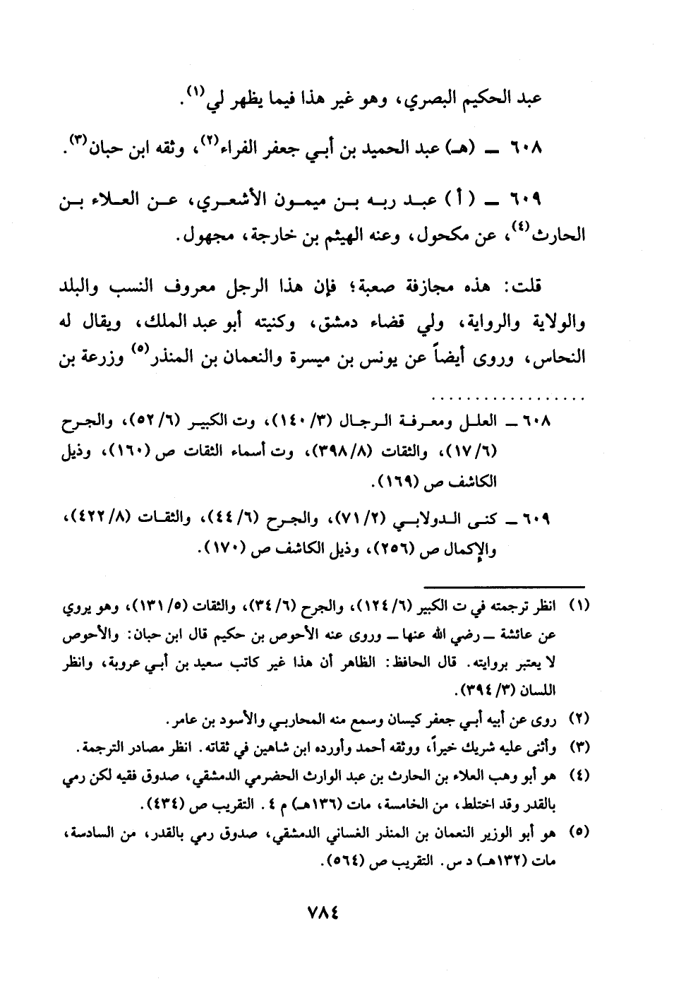 609 - اعبد ربه بن مَيْمُون الْأَشْعَرِيّ عَن الْعَلَاء بن الْحَارِث عَن مَكْحُول وَعنهُ الْهَيْثَم بن خَارِجَة مَجْهُول قلت هَذِه مجازفة صعبة فَإِن هَذَا الرجل مَعْرُوف النّسَب والبلد وَالْولَايَة وَالرِّوَايَة ولي قَضَاء دمشق وكنيته أَبُو عبد الْملك وَيُقَال لَهُ النّحاس وروى أَيْضا عَن يُونُس بن ميسرَة والنعمان بن الْمُنْذر وزرعة بن