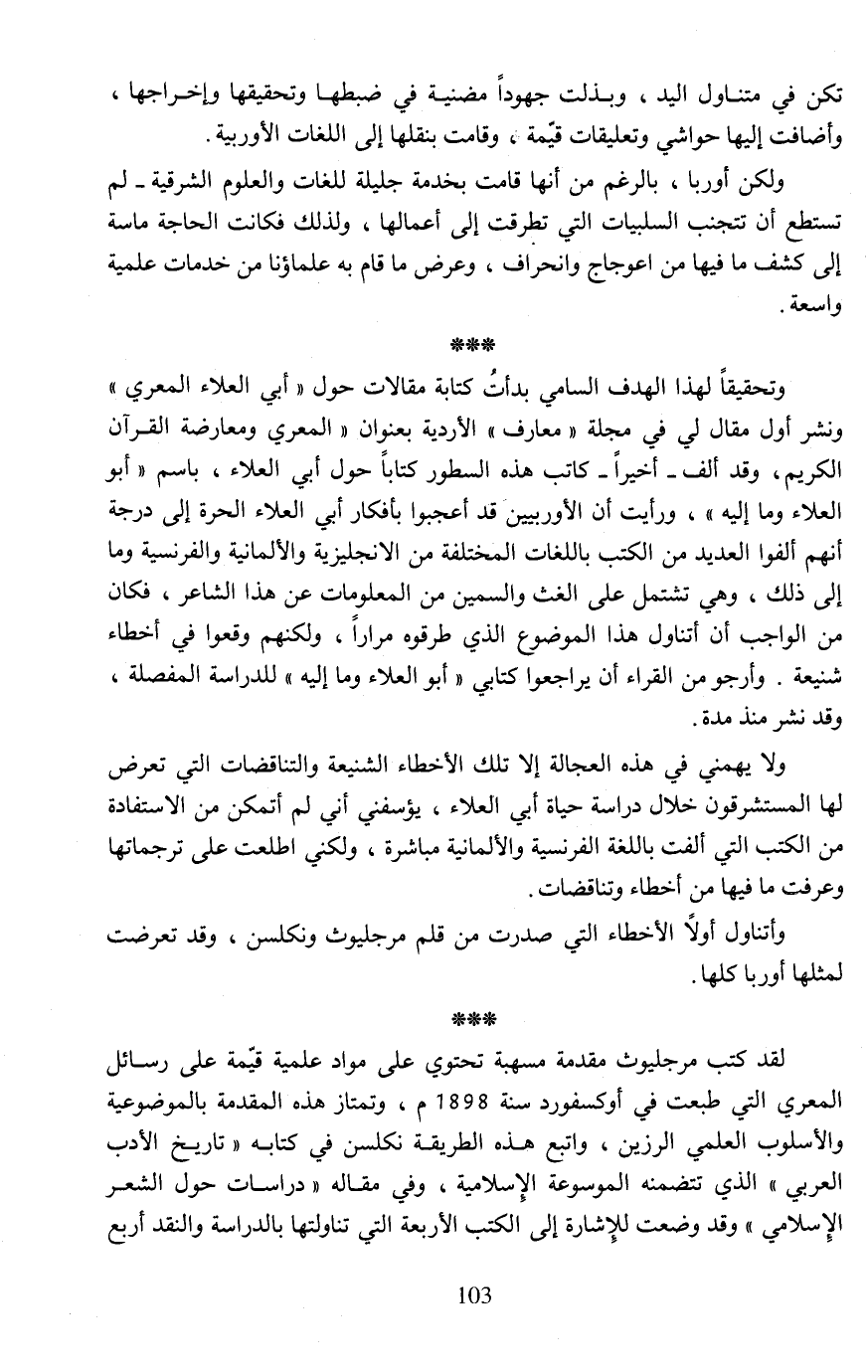 ولا يهمني في هذه العجالة إلا تلك الأخطاء الشنيعة والتناقضات التي تعرض لها المستشرقون خلال دراسة حياة أبي العلاء، يؤسفني أني لم أتمكن من الاستفادة من الكتب التي ألفت باللغة الفرنسية والألمانية مباشرة، ولكني اطلعت على ترجماتها وعرفت ما فيها من أخطاء وتناقضات.