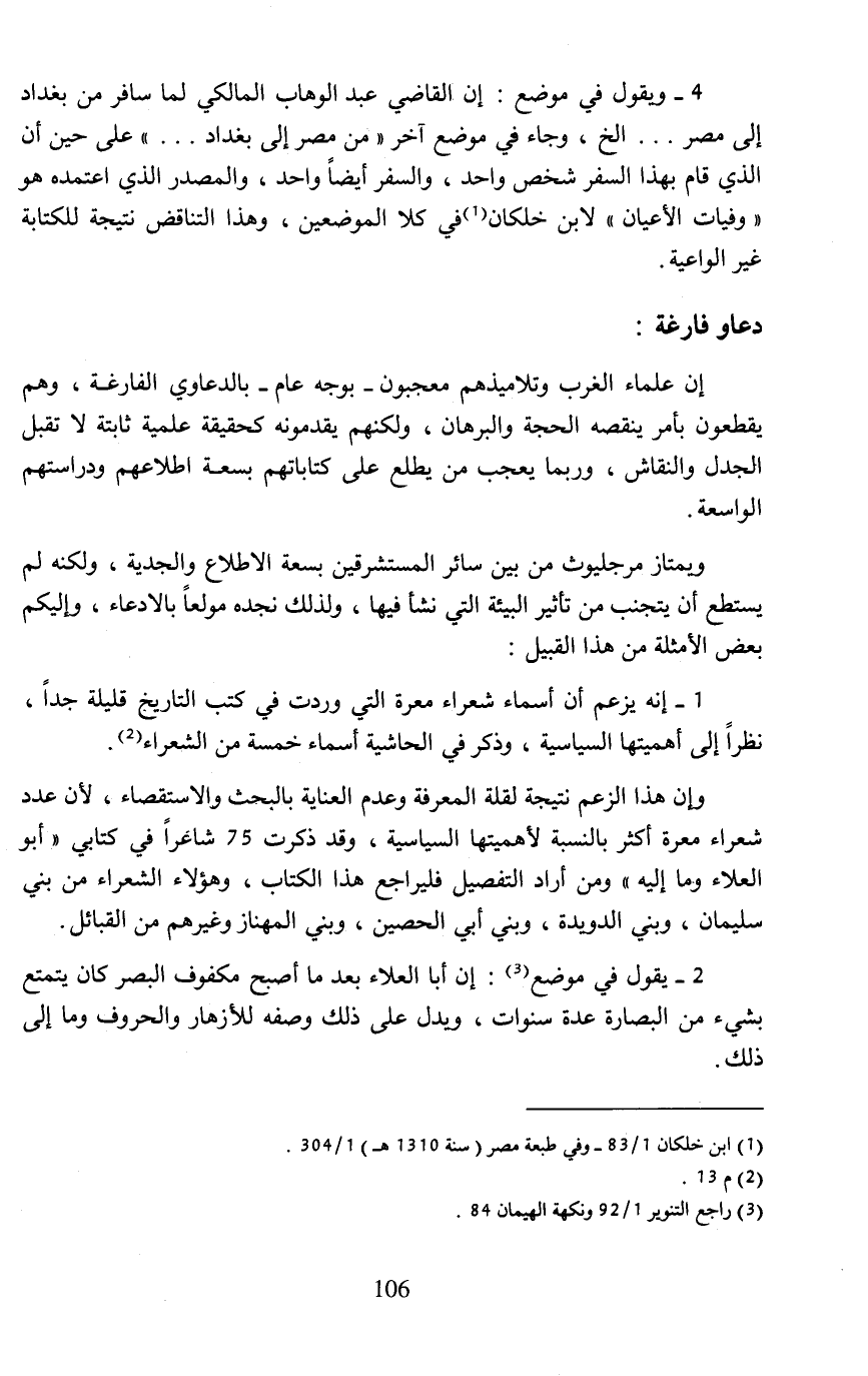 4 - ويقول في موضع: إن القاضي عبد الوهاب المالكي لما سافر من بغداد إلى مصر. . . الخ، وجاء في موضع آخر "من مصر إلى بغداد. . ." على حين أن الذي قام بهذا السفر شخص واحد، والسفر أيضًا واحد، والمصدر الذي اعتمده هو "وفيات الأعيان" لابن خلكان (¬1) في كلا الموضعين، وهذا التناقض نتيجة للكتابة غير الواعية.
