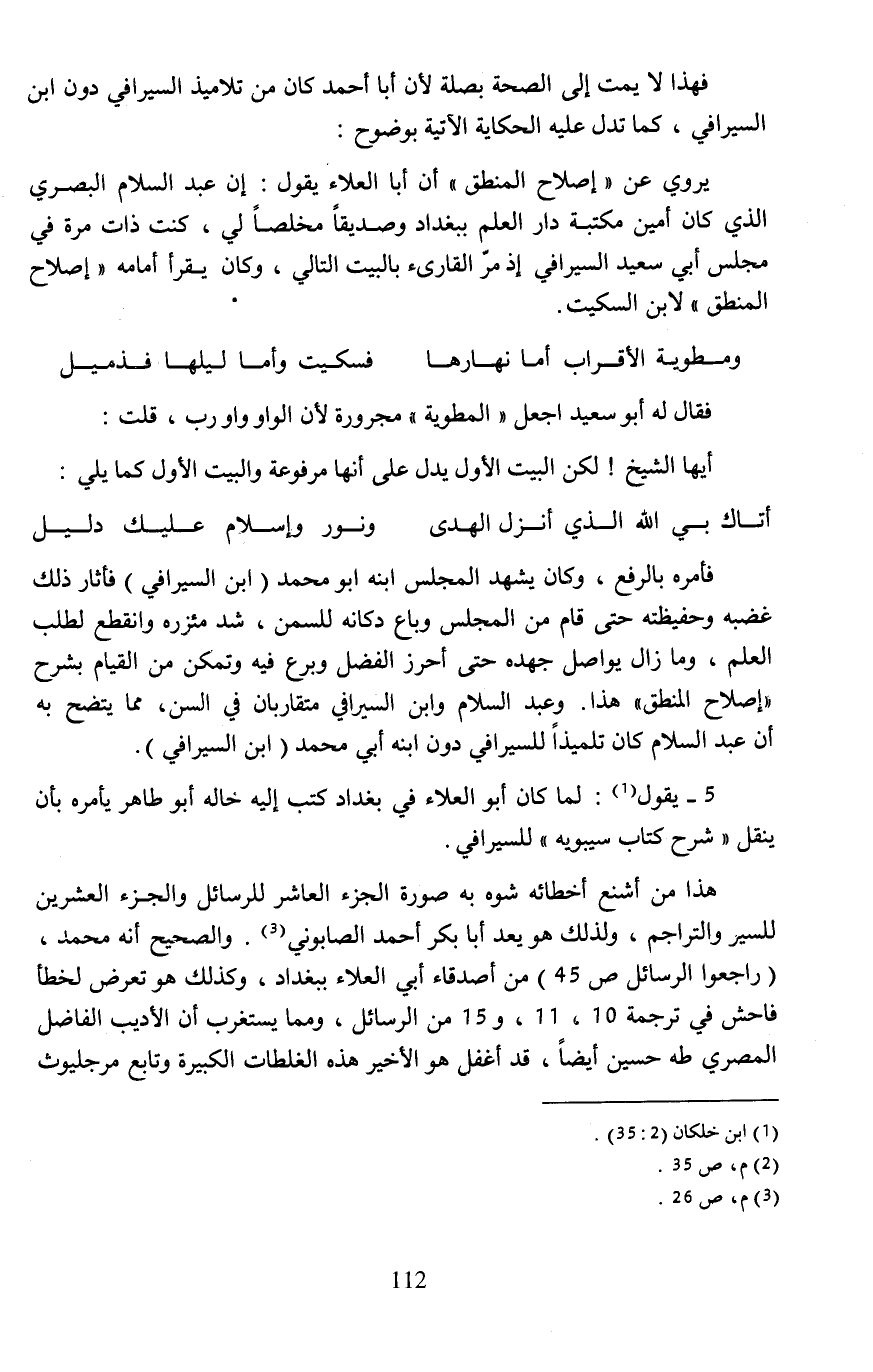 هذا من أشنع أخطائه شوه به صورة الجزء العاشر للرسائل والجزء العشرين للسير والتراجم، ولذلك هو يعد أبا بكر أحمد الصابوني (¬3). والصحيح أنه محمد، (راجعوا الرسائل ص 45) من أصدقاء أبي العلاء ببغداد، وكذلك هو تعرض لخطأ فاحش في ترجمة 11، 10، و 15 من الرسائل، ومما يستغرب أن الأديب الفاضل المصري طه حسين أيضًا، قد أغفل هو الأخير هذه الغلطات الكبيرة وتابع مرجليوث