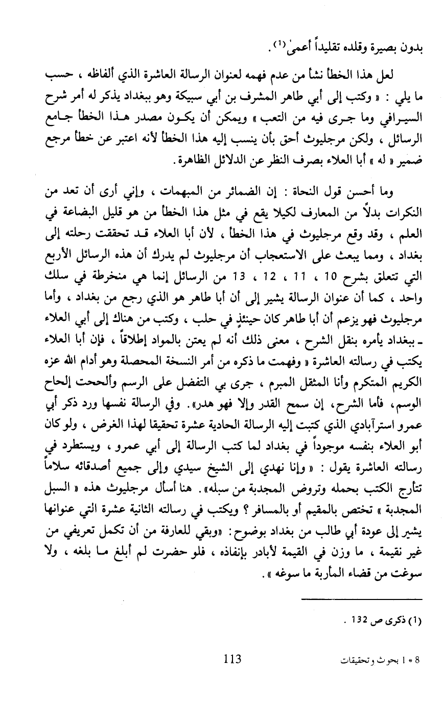 وما أحسن قول النحاة: إن الضمائر من المبهمات، وإني أرى أن تعد من النكرات بدلًا من المعارف لكيلا يقع في مثل هذا الخطأ من هو قليل البضاعة في العلم، وقد وقع مرجليوث في هذا الخطأ، لأن أبا العلاء قد تحققت رحلته إلى بغداد، ومما يبعث على الاستعجاب أن مرجليوث لم يدرك أن هذه الرسائل الأربع التي تتعلق بشرح 10، 11، 12، 13 من الرسائل إنما هي منخرطة في سلك واحد، كما أن عنوان الرسالة يشير إلى أن أبا طاهر هو الذي رجع من بغداد، وأما مرجليوث فهو يزعم أن أبا طاهر كان حينئذٍ في حلب، وكتب من هناك إلى أبي العلاء -ببغداد يأمره بنقل الشرح، معنى ذلك أنه لم يعتن بالمواد إطلاقًا، فإن أبا العلاء يكتب في رسالته العاشرة "وفهمت ما ذكره من أمر النسخة المحصلة وهو أدام الله عزه الكريم المتكرم وأنا المثقل المبرم، جرى بي التفضل على الرسم وألححت إلحاح الوسم، فأما الشرح، إن سمح القدر وإلا فهو هدر". وفي الرسالة نفسها ورد ذكر أبي عمرو استرآبادي الذي كتبت إليه الرسالة الحادية عشرة تحقيقا لهذا الغرض، ولو كان أبو العلاء بنفسه موجودًا في بغداد لما كتب الرسالة إلى أبي عمرو، ويستطرد في رسالته العاشرة يقول: "وإنا نهدي إلى الشيخ سيدي وإلى جميع أصدقائه سلامًا تتأرج الكتب بحمله وتروض المجدبة من سبله". هنا أسأل مرجليوث هذه "السبل المجدبة" تختص بالمقيم أو بالمسافر؟ ويكتب في رسالته الثانية عشرة التي عنوانها يشير إلى عودة أبي طالب من بغداد بوضوح: "وبقي للعارفة من أن تكمل تعريفي من غير نقيمة، ما وزن في القيمة لأبادر بإنفاذه، فلو حضرت لم أبلغ ما بلغه، ولا سوغت من قضاء المأربة ما سوغه".
