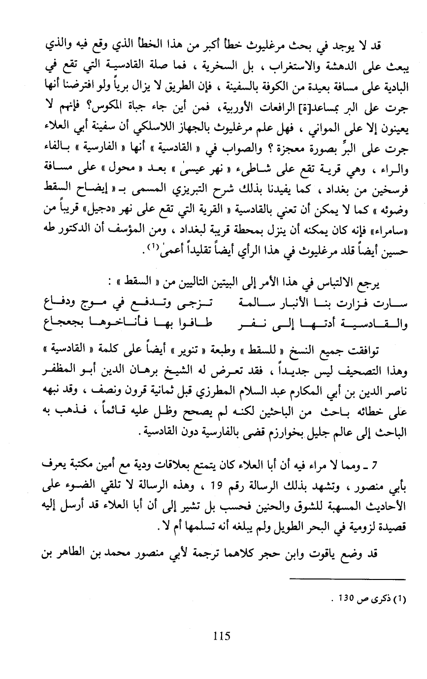 قد لا يوجد في بحث مرغليوث خطأ أكبر من هذا الخطأ الذي وقع فيه والذي يبعث على الدهشة والاستغراب، بل السخرية، فما صلة القادسية التي تقع في البادية على مسافة بعيدة من الكوفة بالسفينة، فإن الطريق لا يزال بريًّا ولو افترضنا أنها جرت على البر بمساعد [ة] الرافعات الأوربية، فمن أين جاء جباة المكوس؟ فإنهم لا يعينون إلا على المواني، فهل علم مرغليوث بالجهاز اللاسلكي أن سفينة أبي العلاء جرت على البرِّ بصورة معجزة؟ والصواب في "القادسية" أنها "الفارسية" بالفاء والراء، وهي قرية تقع على شاطئ "نهر عيسى" بعد "محول" على مسافة فرسخين من بغداد، كما يفيدنا بذلك شرح التبريزي المسمى بـ "إيضاح السقط وضوئه" كما لا يمكن أن تعني بالقادسية "القرية التي تقع على نهر "دجيل" قريبًا من "سامراء" فإنه كان يمكنه أن ينزل بمحطة قريبة لبغداد، ومن المؤسف أن الدكتور طه حسين أيضًا قلد مرغليوث في هذا الرأي أيضًا تقليدًا أعمى (¬1).