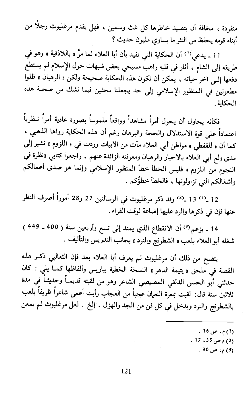 يتضح من ذلك أن مرغليوث لم يعرف أبا العلاء بعد فإن الثعالبي ذكر هذه القصة في ملحق "يتيمة الدهر" النسخة الخطية بباريس وألفاظها كما يلي: كان حدثني أبو الحسن الدلقي المصيصي الشاعر وهو من لقيته قديمًا وحديثًا في مدة ثلاثين سنة قال: لقيت بمعرة النعمان عجبًا من العجاب رأيت أعمى شاعرًا ظريفًا يلعب بالشطرنج والنرد ويدخل في كل فن من الجد والهزل، إلخ. لعل مرغليوث لم يمعن