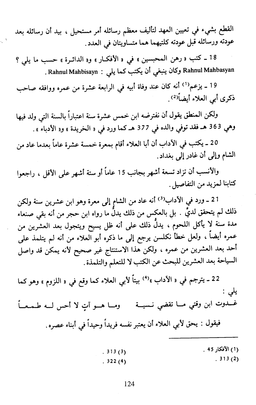 21 - ورد في الآداب (¬3) أنه عاد من الشام إلى معرة وهو ابن عشرين سنة ولكن ذلك له يتحقق لديَّ. بل بالعكس من ذلك يدلُّ ما رواه ابن حجر من أنه بقي صنعاء مدة سنة لا يأكل اللحوم، يدلُّ ذلك على أنه ظل يسيح ويتجول بعد العشرين من عمره أيضًا، ولعل خطأ نكلسن يرجع إلى ما ذكره أبو العلاء من أنه لم يتلمذ على أحد بعد العشرين من عمره، ولكن هذا الاستنتاج غير صحيح لأنه يمكن قد واصل السياحة بعد العشرين للبحث عن الكتب لا للتعلم والتلمذة.