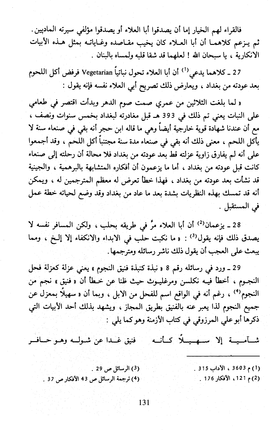27 - كلاهما يدعي (¬1) أن أبا العلاء تحول نباتيًّا Vegetarian فرفض أكل اللحوم بعد عودته من بغداد، ويعارض ذلك تصريح أبي العلاء نفسه فإنه يقول: