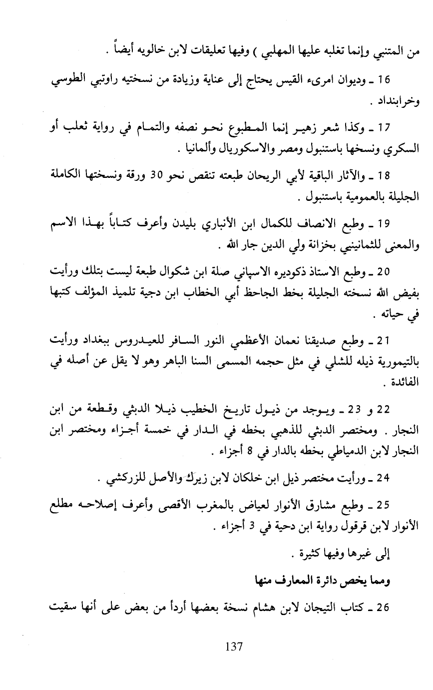 19 - وطبع الإنصاف للكمال ابن الأنباري بليدن وأعرف كتابًا بهذا الاسم والمعنى للثمانيني بخزانة ولي الدين جار الله.