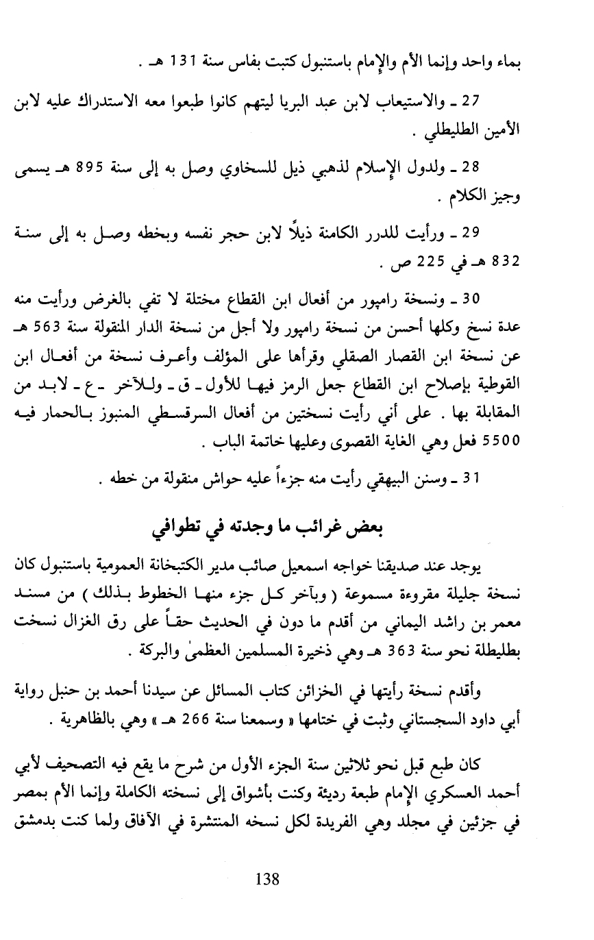 30 - ونسخة رامبور من أفعال ابن القطاع مختلة لا تفي بالغرض ورأيت منه عدة نسخ وكلها أحسن من نسخة رامبور ولا أجل من نسخة الدار المنقولة سنة 563 هـ عن نسخة ابن القصار الصقلي وقرأها على المؤلف وأعرف نسخة من أفعال ابن القوطية بإصلاح ابن القطاع جعل الرمز فيها للأول- ق- وللآخر- ع- لا بد من المقابلة بها. على أني رأيت نسختين من أفعال السرقسطي المنبوز بالحمار فيه 5500 فعل وهي الغاية القصوى وعليها خاتمة الباب.