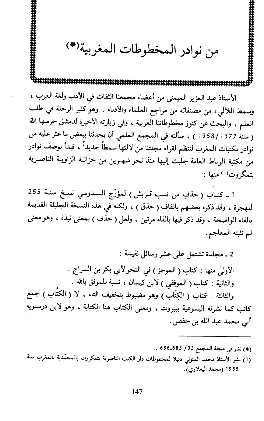الأستاذ عبد العزيز الميمني من أعضاء مجمعنا الثقات في الأدب ولغة العرب، وسمط اللآليء من مصنفاته من مراجع العلماء والأدباء. وهو كثير الرحلة في طلب العلم، والبحث عن كنوز مخطوطاتنا العربية، وفي زيارته الأخيرة لدمشق حرسها الله (سنة 1377/ 1958)، سألته في المجمع العلمي أن يحدثنا ببعض ما عثر عليه من نوادر مكتبات المغرب لننظم لقراء مجلتنا من لآلئها سمطًا جديدًا، فبدأ بوصف نوادر من مكتبة الرباط العامة جلبت إليها منذ نحو شهرين من خزانة الزاوية الناصرية بتمكروت (¬1) منها: