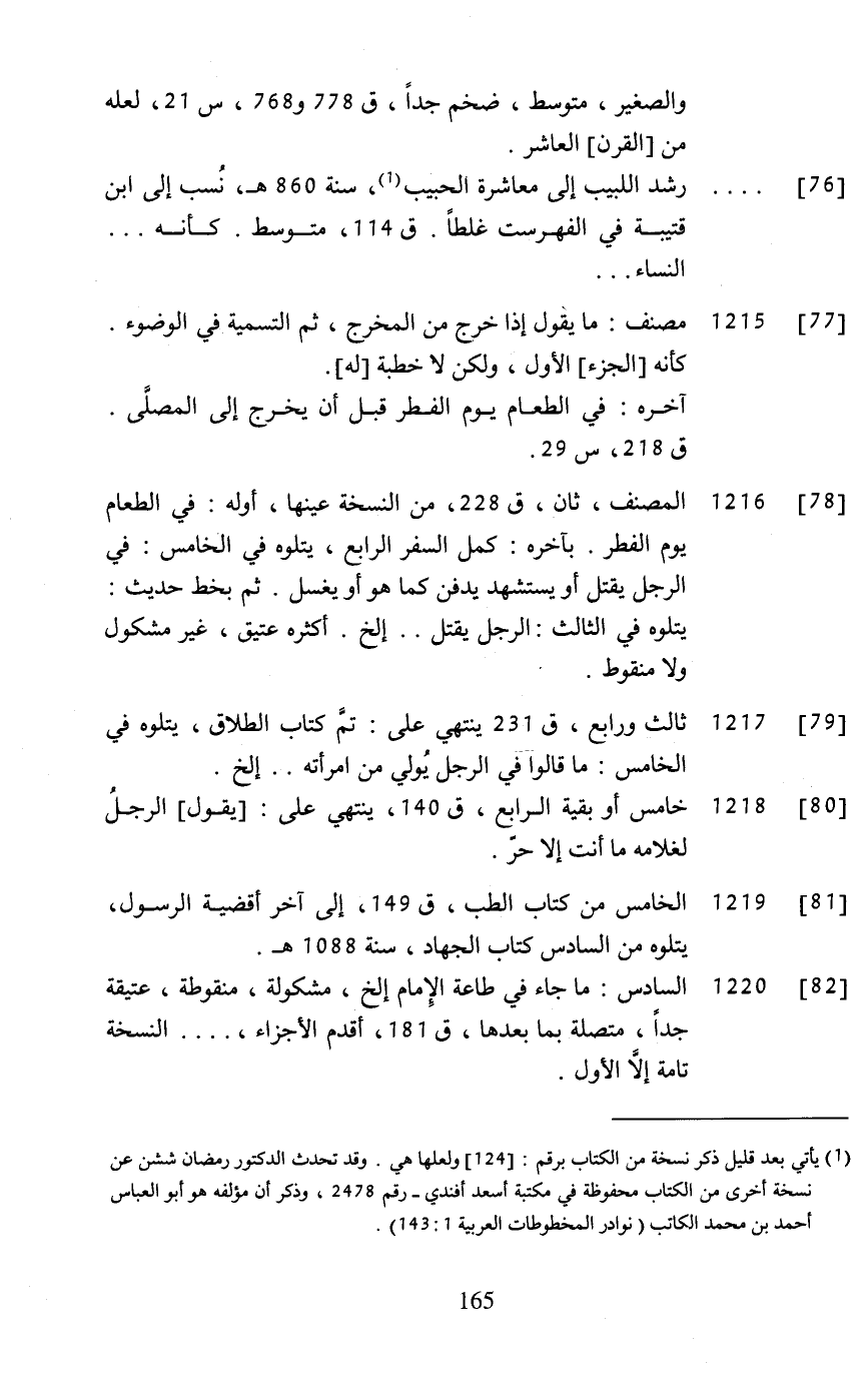 [78] ... 1216 ... المصنف، ثان، ق 228، من النسخة عينها، أوله: في الطعام يوم الفطر. بآخره: كمل السفر الرابع، يتلوه في الخامس: في الرجل يقتل أو يستشهد يدفن كما هو أو يغسل. ثم بخط حديث: يتلوه في الثالث: الرجل يقتل .. إلخ. أكثره عتيق، غير مشكول ولا منقوط.