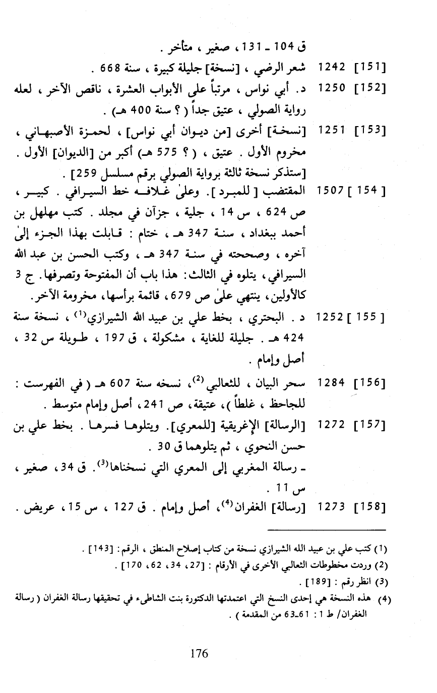 (¬4) هذه النسخة هي إحدى النسخ التي اعتمدتها الدكتورة بنت الشاطئ في تحقيقها رسالة الغفران (رسالة الغفران / ط 1: 61 - 63 من المقدمة).