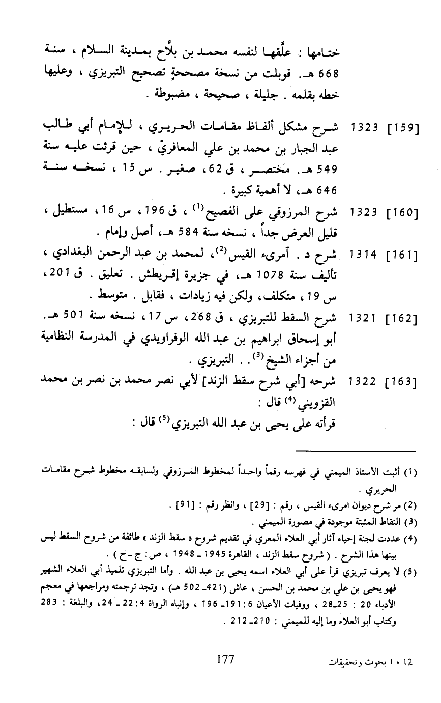 [159] ... 1323 ... شرح مشكل ألفاظ مقامات الحريري، للإمام أبي طالب عبد الجبار بن محمد بن علي المعافريّ، حين قرئت عليه سنة 549 هـ. مختصر، ق 62، صغير. س 15، نسخه سنة 646 هـ، لا أهمية كبيرة.