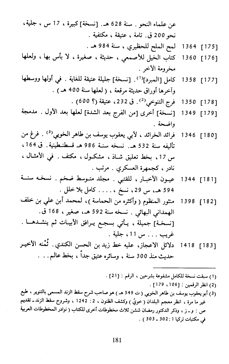 [177] ... 1358 ... كامل [المبرد] (¬1) [نسخة] جليلة عتيقة للغاية. في أولها ووسطها وآخرها أوراق حديثة مرقعة، (لعلها سنة 400 هـ).